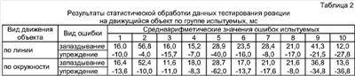 Анализ результатов вычислений показывает совпадение преобладаний среднеарифметических значений ошибок запаздывания или упреждения, полученных по предлагаемому и известному способам. Это свидетельствует об эквивалентности предлагаемого способа тестирования реакции человека на движущийся объект с известным.