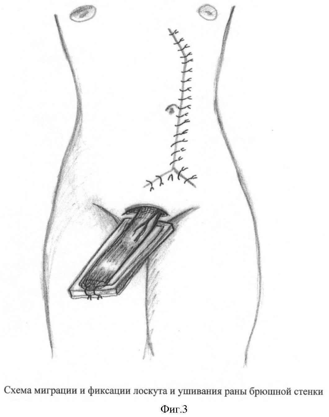 Фиг.3 – схема миграции и фиксации лоскута и ушивания раны брюшной стенки.
