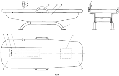 Внутри корпуса 1 под головной частью 3 кушетки 2 (под прямоугольной прорезью 4) размещены (фиг.2-4):