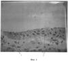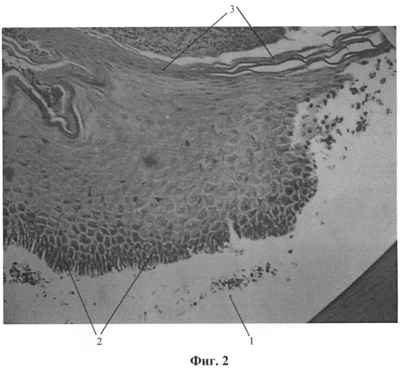 Как видно на фиг.1, на раневой поверхности 1 наблюдается быстрый горизонтальный рост базальных эпидермоцитов 2 в 1-2 слоя клеток, в то же время при использовании только пленочного (фиг.2) или только гелевого (фиг.3) покрытия на раневой поверхности 1 наблюдается бурный вертикальный рост эпидермоцитов 2 с быстрой его дифференцировкой и кератинизацией 3.