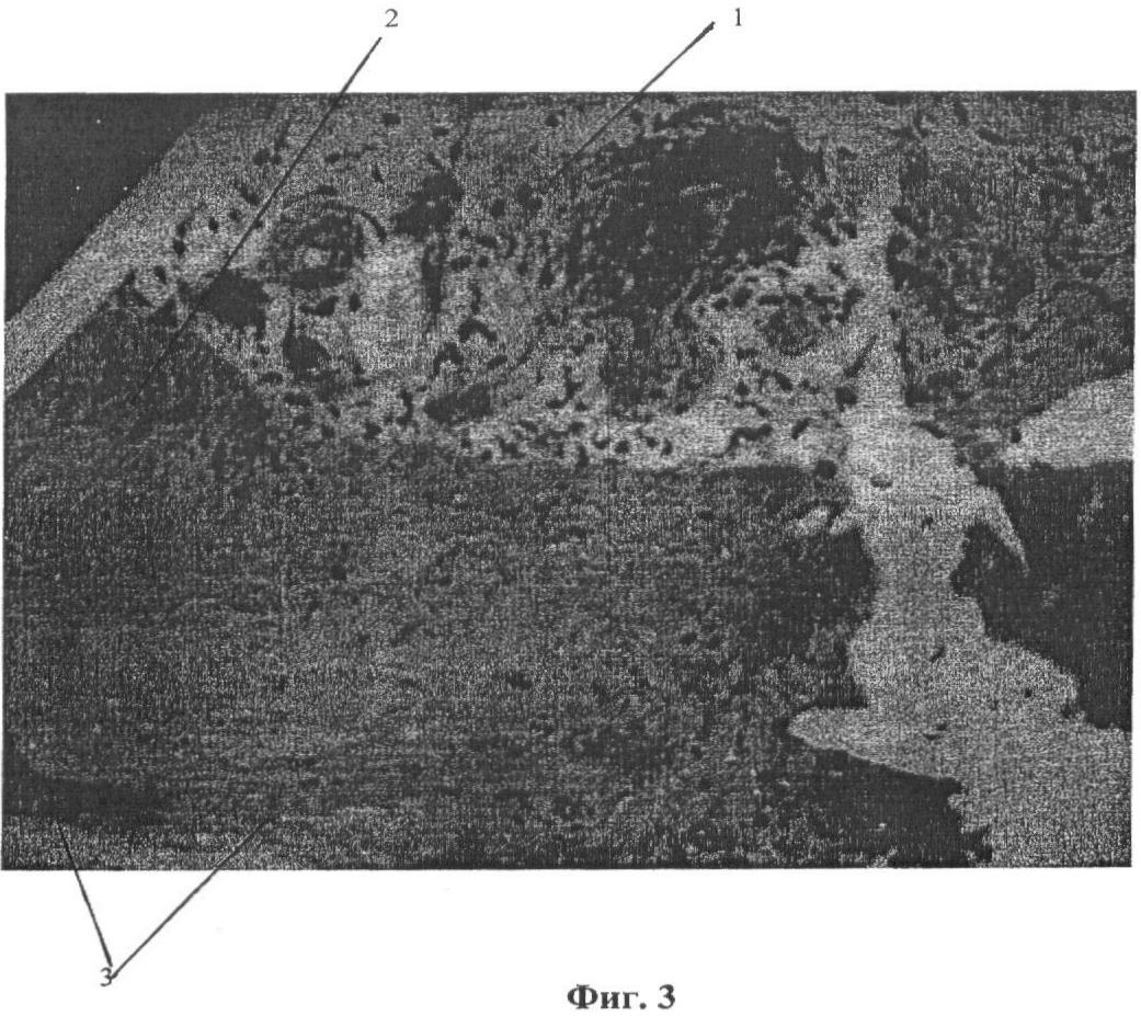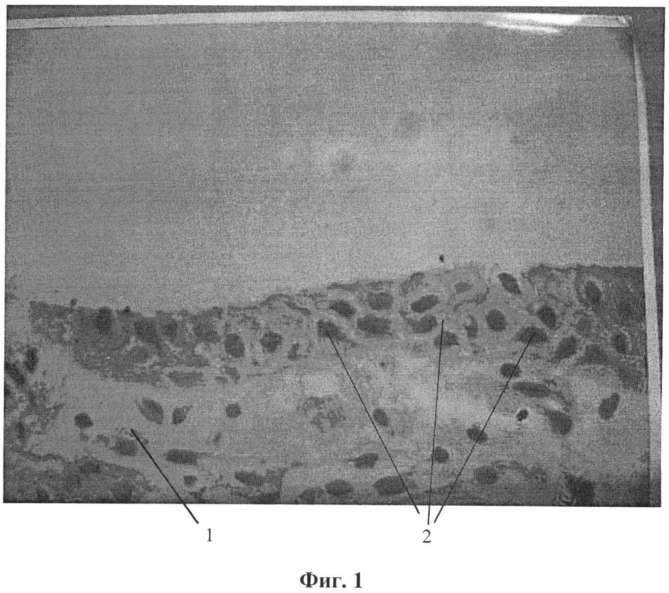 Это подтверждается фотографиями гистологических препаратов, где на фиг.1 (при увеличении ×800) представлен поперечный срез участка раневой поверхности на третьи сутки лечения с помощью предлагаемого способа, на фиг.2 (при увеличении ×400) – поперечный срез участка раневой поверхности на третьи сутки лечения с помощью пленочного покрытия («Биокол – пленка» по примеру 1), на фиг.3 (при увеличении ×400) – поперечный срез участка раневой поверхности на третьи сутки лечения с помощью гелевого покрытия («Биокол – гель» по примеру 1). Препараты окрашены традиционно по методике Гематоксилин – Эозин («Практическая микротехника и гистохимия», Д. Кисели, Будапешт, 1962, стр.115).