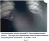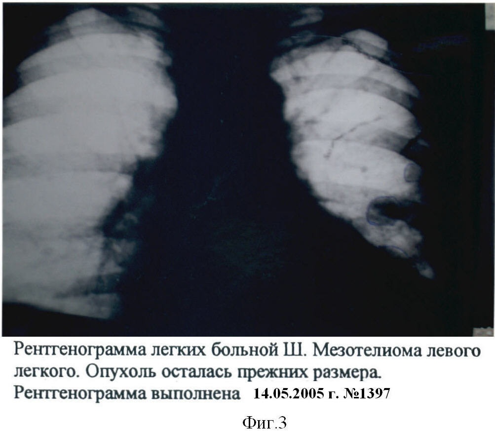 На фиг.1 четко просматривается круглое образование в средней трети левого легкого. Сверху видны скобки, наложенные после первой операции. На фиг.2 так же просматриваются два образования – в области 5-го ребра и расположенное частично за тенью сердца. И на фиг.3 представлена рентгенограмма от 14.05.2005 г., где так же видны эти 2 образования, не измененные в размерах.