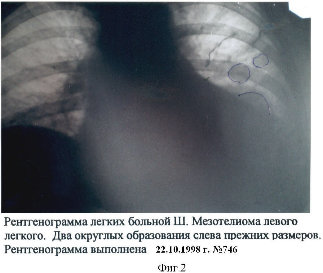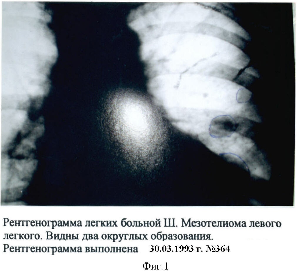 Больная Ш., 1940 г. рождения, взята на лечение в марте 1993 г. Больна с октября 1990 г., когда больной сделана торакотомия S1-2 левого легкого S4-5, плоскостная резекция по поводу мезотелиомы и очагового туберкулеза в фазе уплотнения ВК (-). Диагноз подтвердился гистологически, исследование 18568-76 от 23.10.90 г. Больная была взята на диспансерный учет, получала симптоматическое лечение.