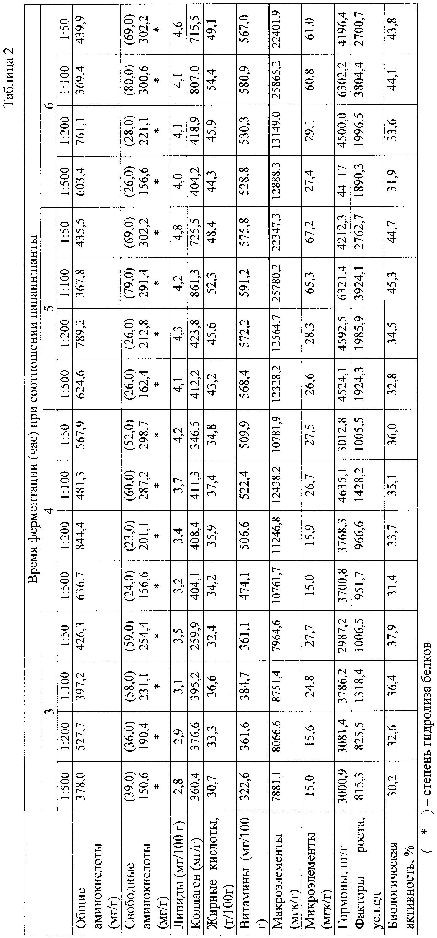 Во втором опыте экстракт, полученный при оптимальном режиме (4-часовая экстракция при разведении 1:5) с биологической активностью 27,2% был подвергнут ферментации при 40°С. В качестве фермента был использован папаин активностью 30 тыс. ЕД при рН 4,5 и соотношении папаин: панты 1:500, 1:200, 1:100, 1:50 при 3-, 4-, 5-часовой длительности процесса (табл.2). Папаин – монотиоловая цистеиновая протеаза, которую получают из тропического многолетнего пальмоподобного растения – папайи или дынного дерева. Папаин содержит липазу, хитиназу, лизоцим, комплекс протеолитических ферментов, включающий: пептидазу (расщепляет белки на ди- и полипептиды), ренинподобный коагулирующий фермент (свертывает казеин молока), амилолитический фермент, свертывающий фермент, подобный пектазе, липолитический фермент. По характеру ферментативного действия его называют «растительным пепсином», но в отличие от пепсина он активен не только в кислых, но и в нейтральных и щелочных средах (диапозон рН 3-12, оптимум при рН 5). Папаин расщепляет белки до полипептидов и аминокислот, причем гидролизует любые пептидные связи. Он обладает большей способностью к расщеплению белка по сравнению с другими протеазами животного и бактериального происхождения.
