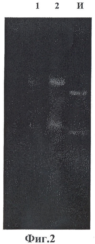 При анализе препарата гель-фильтрацией на колонке с сефарозой CL-6B показано, что собранная нанобиочастица элюируется ранее исходной РНК, в свободном объеме (свободный объем для сефарозы CL-6B, согласно паспортным характеристикам фирмы изготовителя, от 4 МДа и выше). Анализ наночастицы и ее компонента, дсРНК, покрытой оболочкой из полиглюкина, электрофорезом в 1%-ном геле агарозы показал, что в каждом образце присутствует два вида частиц, соответствующих L- и М-формам дсРНК (Фиг.2). Судя по размеру зон, частицы сохраняют компактную и однородную форму. Их подвижность в электрофорезе снижается, по сравнению с компонентами исходной дсРНК, что свидетельствует об увеличении их массы и объема, т.е. об образовании наноструктур.