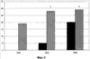 По оси абсцисс – доза препаратов, мг/кг; по оси ординат – гибель животных, %, при введении ФНО- (темные столбики) или наночастиц с ФНО- (столбики со штриховкой).