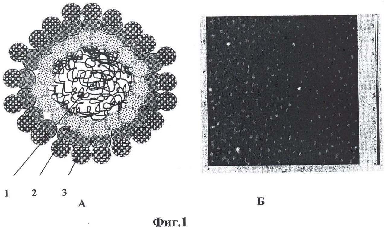 Каждая наночастица (фиг.1) содержит ядро 1, состоящее из полинуклеотидного комплекса, представляющего собой двуспиральную РНК (дсРНК) – индуктор интерфероногенеза, покрытое слоем 2 конъюгата спермидин/полиглюкина и прикрепленных к нему молекул 3 рекомбинантного фактора некроза опухолей альфа человека (ФНО- ), удерживаемого за счет ионного взаимодействия между отрицательно заряженным полинуклеотидным комплексом и положительно заряженным спермидином. В качестве двуспиральной РНК противоопухолевое средство содержит двуспиральную РНК из дрожжей Saccharomyces cerevisiae. Наночастицы имеют сферическую форму с размером порядка 50-70 нм, что позволяет избежать захвата их клетками ретикуло-эндотелиальной системы организма. Причем на одну молекулу двуспиральной РНК из дрожжей Saccharomyces cerevisiae приходится 60-80 молекул рекомбинантного человеческого ФНО- с цитолитической активностью не ниже 106 МЕ/мг белка, 60-80 молекул полиглюкина и 1000-1300 молекул спермидина.