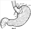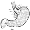 Фиг.1 – схема устройства для лечения от ожирения, установленного на абдоминальном участке пищевода, пищеводно-желудочном переходе и проксимальном кардиальном участке желудка пациента;