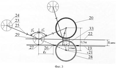 – при продлении траекторий 25 полета центра мяча 23 за плоскость основного щита 19 получают их пересечение в одной точке т.21 – фиг.3, что позволяет установить центр воображаемого баскетбольного кольца, симметрично расположенного основному кольцу 20 относительно мнимого щита 22;