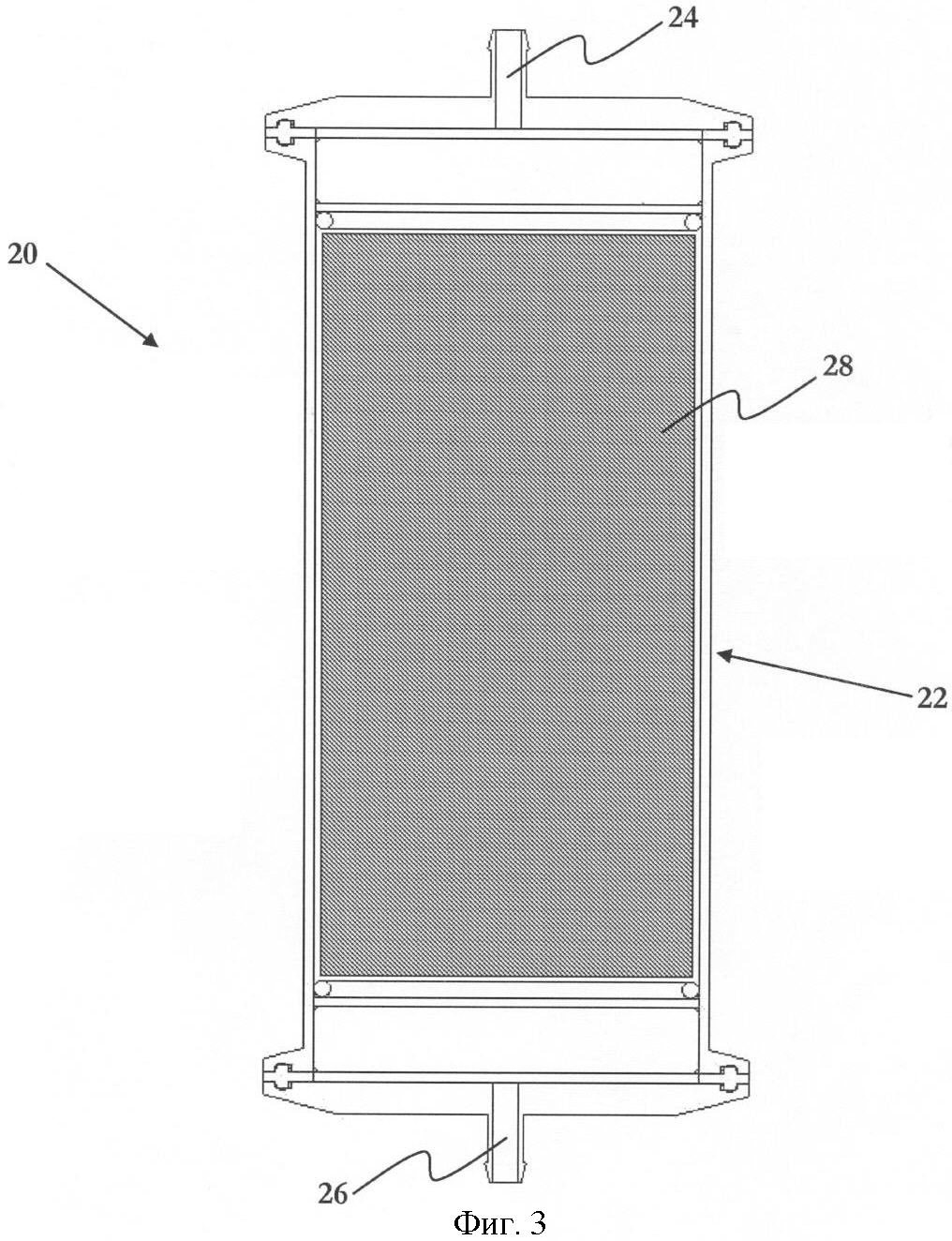 В соответствии с одним вариантом осуществления, как показано на фиг.3, представлен фильтр 20 для получения питьевой воды. Фильтр 20 состоит из корпуса 22, включающего в себя впускное отверстие 24 для воды и выпускное отверстие 26 для воды. Вариант осуществления по фиг.3 иллюстрирует устройство цилиндрической формы; однако корпус 22 может быть исполнен в различных формах, размерах и конфигурациях в зависимости от предполагаемого использования фильтра, как известно в уровне техники. Например, фильтр может быть фильтром осевого потока, в котором впускное отверстие и выпускное отверстие расположены таким образом, что жидкость течет вдоль оси корпуса. Альтернативно, фильтр может быть фильтром радиального потока, в котором впускное отверстие и выпускное отверстие расположены так, что жидкость течет по радиусу корпуса. И далее, фильтр может включать в себя одновременно и осевой, и радиальный потоки. Корпус может также быть частью другого устройства без отхода от объема настоящего изобретения.