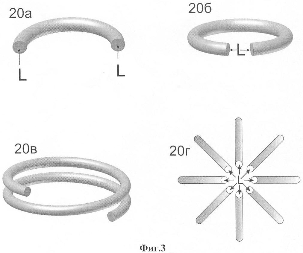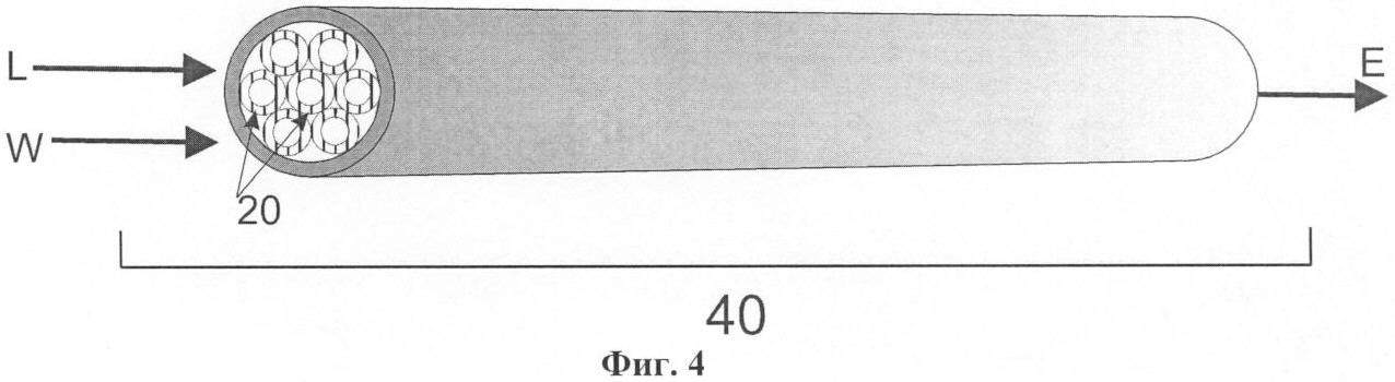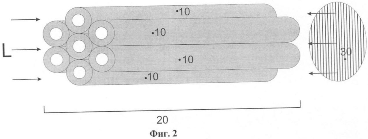 Для увеличения интенсивности светового потока излучения, попадающего на фотокатализатор, реактор может быть снабжен отражателем 30 (Фиг.2), направляющим рассеянный свет обратно в систему микроканалов, либо дополнительным источником ультрафиолетового излучения, расположенным с противоположной стороны массива микроканалов 20а (Фиг.3). В случае кольцевой или другой замкнутой системы микроканалов такие отражатели могут не использоваться – и начальная и конечная области примыкают непосредственно к источнику излучения L (Фиг.3, 20б). Предлагаемый фотореактор может быть снабжен более чем одним набором микроканальных капилляров с фотокатализатором для полного использования светового потока от источника ультрафиолетового излучения, в зависимости от его геометрической формы (Фиг.3, 20 г).