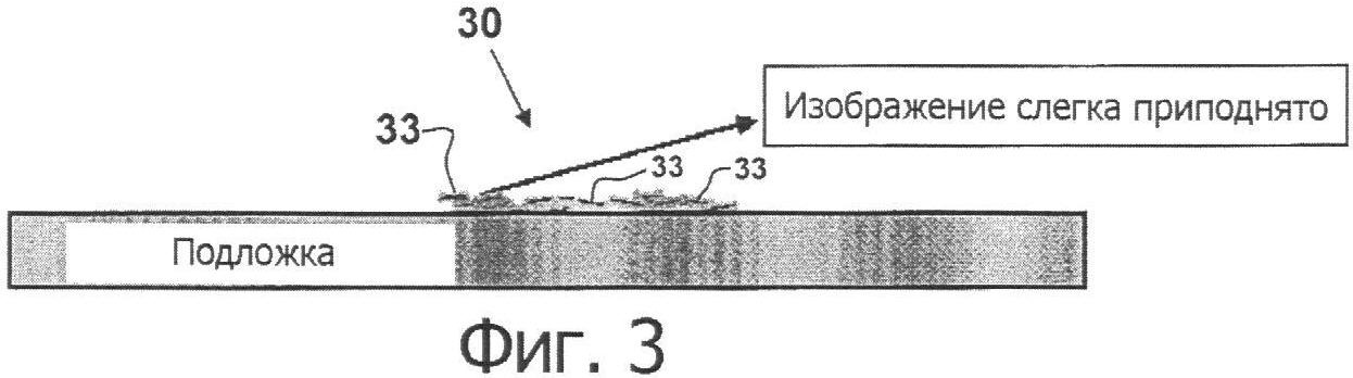 На фиг.3 показано напечатанное изображение 30, лишь слегка возвышающееся над подложкой. Имеется множество способов нанесения оптически изменяемых печатных красок на подложку. В противоположность бытующему представлению, обычно при удалении печатающей головки или печатного пресса, чешуйки внутри носителя теряют ориентацию, и многие чешуйки 33 не лежат параллельно подложке. Таким образом, за счет просто печати обеспечивается лишь небольшое управление ориентацией чешуек внутри печатной краски. Способность управлять ориентацией чешуек обеспечивает средство для рисования и изготовления изображений. Оптические эффекты зависят от ориентации чешуек, таким образом, прилагались большие усилия для создания средств для управления ориентацией чешуек пигмента.
