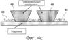 На фиг.4с показан другой вариант выполнения данного изобретения, в котором гравировальный инструмент 48 выполнен с возможностью удаления большинства или всех чешуек с большим отношением высоты к ширине при контакте инструмента с подложкой. Дно выгравированных зон 49 может содержать или может не содержать печатной краски в зависимости от глубины, давления и формы или материала инструмента, используемого для создания выгравированного изображения. В показанном варианте выполнения гравировальный инструмент 48 имеет плоское дно и клиновидные стороны, которые вытесняют большинство печатной краски из-под него. Как показано на фиг.4d, в области, соседней с областью, где отсутствует печатная краска, т.е. в области, куда была перемещена печатная краска, чешуйки являются оптически активными, однако чешуйки 45, стоящие вертикально относительно подложки, кажутся черными и не являются оптически активными.