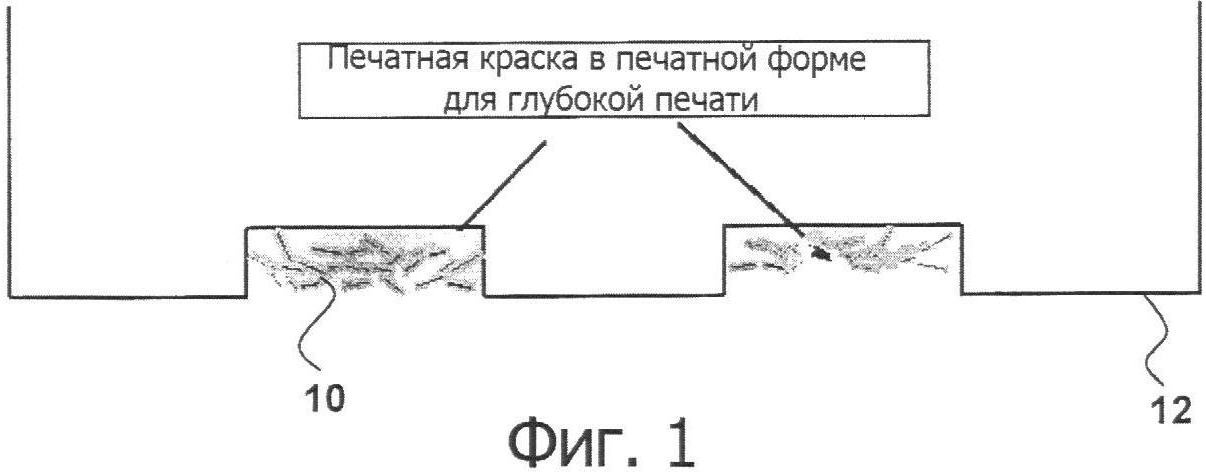 фиг.1 – разрез печатной формы для глубокой печати с печатной краской, при этом печатная краска включает оптически изменяемые частицы;