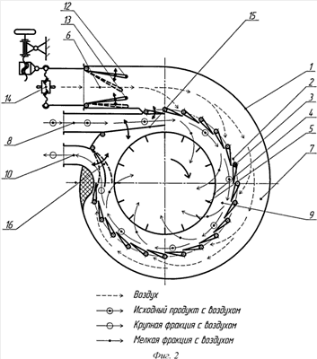 Снабжение патрубка ввода продукта с воздухом регулируемой поворотной заслонкой с возможностью изменения величины зазора между заслонкой и воздухораспределительной решеткой позволяет увеличить скорость воздушного потока и, следовательно, скорость относительного движения частиц вдоль воздухораспределительной решетки, усиливая, таким образом, центробежную силу инерции частиц, движущихся в кольцевом пространстве между решеткой и рабочим колесом. Поскольку воздушный поток с исходным продуктом подается в патрубок посредством пневмотранспортирования, то изменение расхода этого потока нежелательно. В этом случае требуемая скорость потока устанавливается регулированием зазора между концом заслонки и решеткой, обеспечивая, таким образом, наилучшие показатели классификации продукта на фракции по крупности частиц.