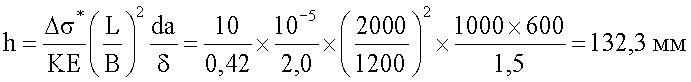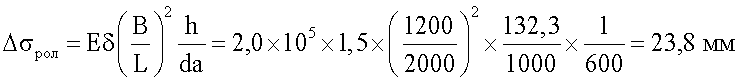 Пример. При прокатке полосы шириной В=1200 мм при удельном переднем натяжении 1=100 МПа разница между удельными напряжениями в середине и на краю полосы  *=+10 МПа. Расстояние между осями профилированных роликов и рабочих валков а=600 мм, расстояние между осями профилированных и отклоняющих роликов d=1000 мм, длина бочки рабочих валков L=2000 мм, выпуклость профилированных роликов на радиусе =1,5 мм, модуль упругости материала полосы Е=2,0×105 МПа. Вычисленный по формуле (1) коэффициент ослабления равен K=0,42. В этом случае высота перемещения отклоняющих роликов: