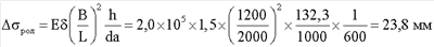 где  * – разница между удельными напряжениями в середине и на краю полосы, положительная при форме эпюры напряжений, способствующей волнистости полосы, и отрицательная при форме эпюры напряжений, способствующей коробоватости, МПа; K – коэффициент ослабления неравномерности по принципу Сен-Венана; Е – модуль упругости материала полосы, МПа; L – длина бочки профилированных роликов, мм; В – ширина полосы, мм; d – расстояние между осями профилированных роликов и отклоняющих роликов, мм; а – расстояние между осями рабочих валков и профилированных роликов, составляющее не более половины длины бочки, мм;