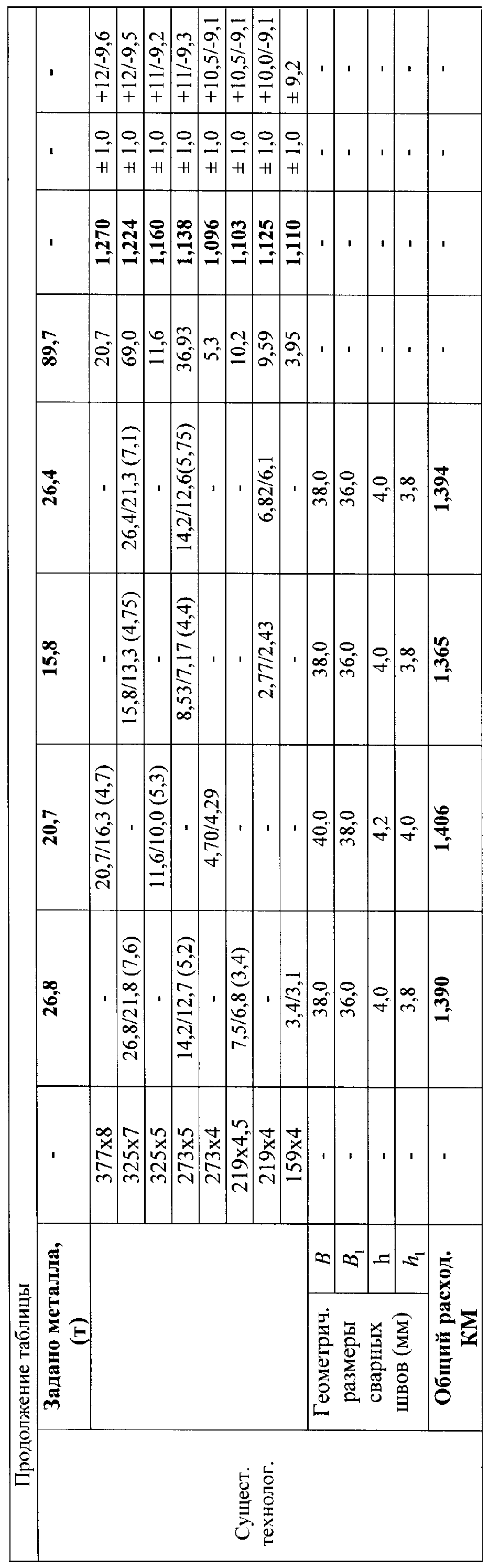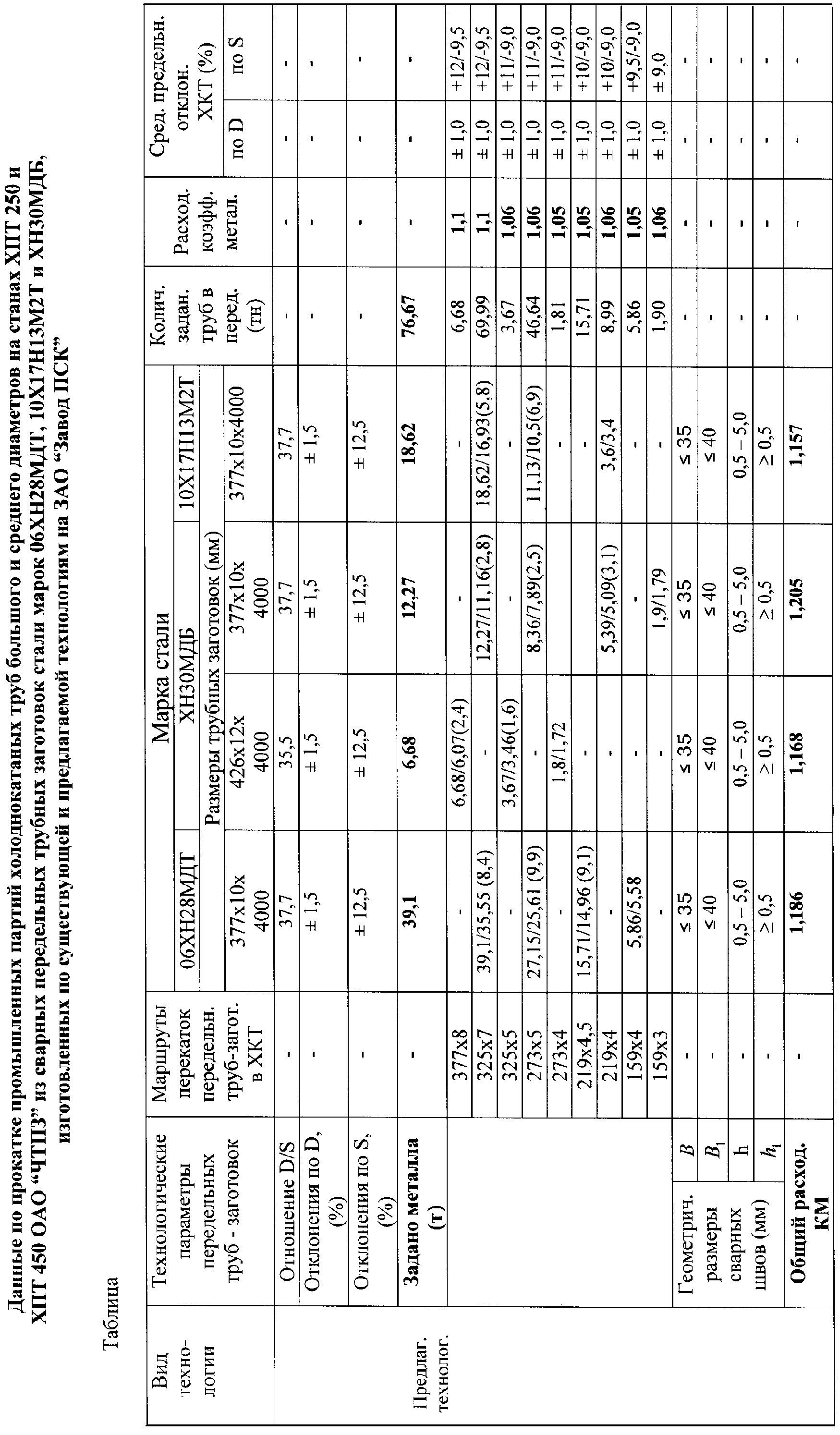 Изобретение относится к способу производства передельной трубной заготовки для прокатки холоднокатаных труб большого и среднего диаметров из труднодеформируемых марок стали и сплавов. Способ включает производство листовой заготовки, строжку листа по ширине, подготовку кромок листа к сварке, формовку листовой заготовки в трубную передельную заготовку и сварку продольных кромок нерасходуемым или расходуемым электродом той же марки стали, формовку передельной трубной заготовки производят на вальцах длиной до 4,5 м с отношением диаметра к толщине стенки D/S=20-40, при этом ширину швов и высоту валиков швов передельной трубной заготовки определяют из выражений: В=K×D/S, B1=K1×D/S, h=K2S, h1=K3S, где В – ширина валиков наружных швов передельных трубных заготовок, мм; B1 – ширина валиков внутренних швов передельных трубных заготовок, мм; D – наружный диаметр передельных трубных заготовок, мм; S – толщина стенки передельных трубных заготовок, мм; K=1,0-1,5 – коэффициент для определения ширины валиков наружных швов, большие значения которых относятся к передельным трубным заготовкам с меньшим отношением D/S; K1=0,95-1,3 – коэффициент для определения ширины валиков внутренних швов, большие значения которых относятся к передельным трубным заготовкам с меньшим отношением D/S; h – высота усиления валиков наружных швов, мм; h1 – высота усиления валиков внутренних швов, мм; K2=0,1-0,25 – коэффициент для определения высоты валиков наружных швов, большие значения которых относятся к передельным трубным заготовкам с меньшими толщинами стенок; K3=0,1-0,15 – коэффициент для определения высоты валиков внутренних швов, большие значения которых относятся к передельным трубным заготовкам с меньшими толщинами стенок. Обеспечивается производство качественных труб в соответствии с ГОСТ 9941 из сварных передельных трубных заготовок вместо бесшовных и значительное снижение расходного коэффициента металла при переделе: передельная прямошовная трубная заготовка – холоднокатаная труба, а следовательно, снижение стоимости холоднокатаных труб из труднодеформируемых марок стали и сплавов. 4 з.п. ф-лы, 1 табл.