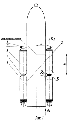 Датчик определения давления 8 ускорителя 2 связан через систему управления ракеты-носителя с детонаторами 7 детонирующих удлиненных зарядов 6 на газоводе 5 диаметрально противоположного ускорителя. Детонирующие заряды установлены на наружной части поверхности газовода, наиболее удаленной от оси центрального маршевого двигателя, в секторе менее 180°.