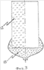 Продольный разрез фильер 9 с профилированным каналом 10 и истекающей струей 11 расплава базальта представлены на фиг.2, разрез А-А на фиг.1. На фиг.3 представлен продольный разрез фильер с цилиндрическим каналом 12 щелевого фильерного питателя-прототипа с каплеобразной струей 13 расплавленного базальта на срезе выходного отверстия фильер.