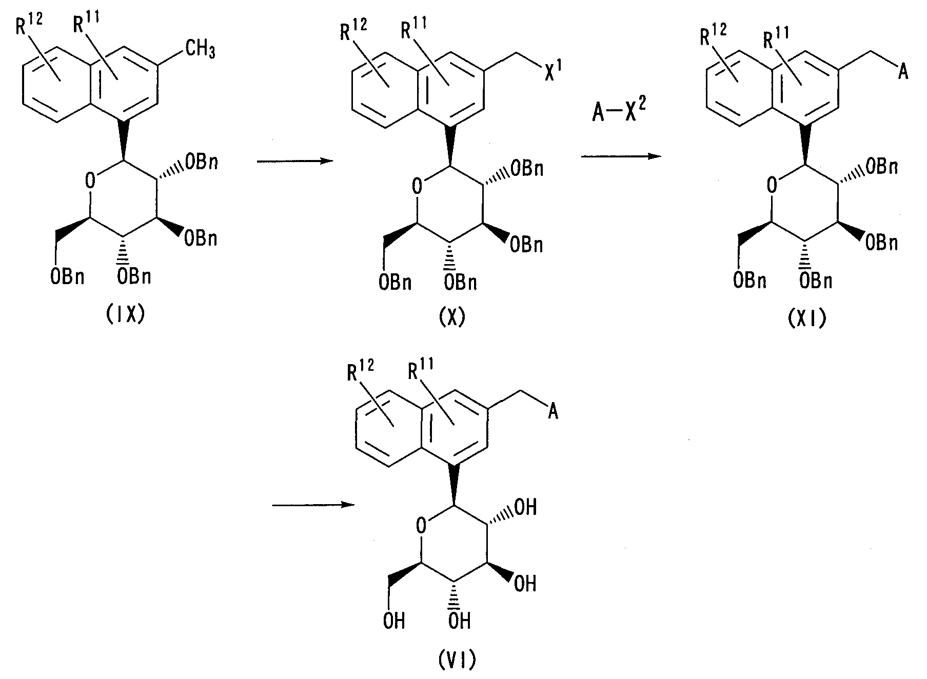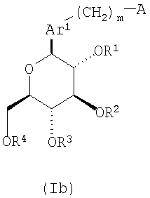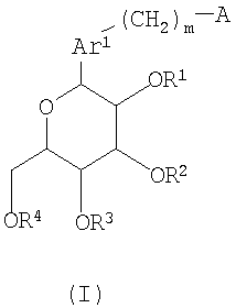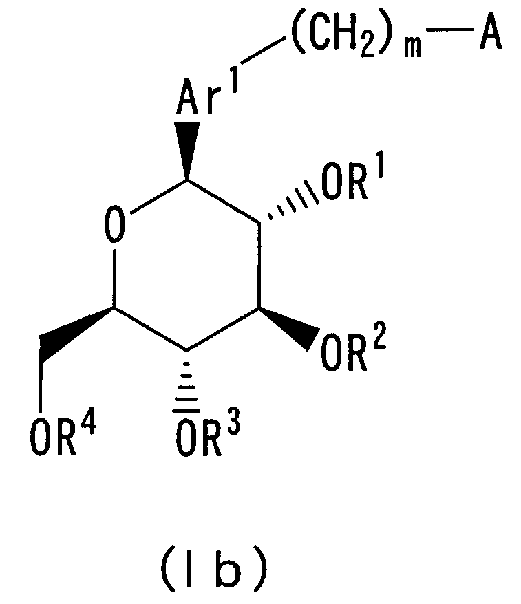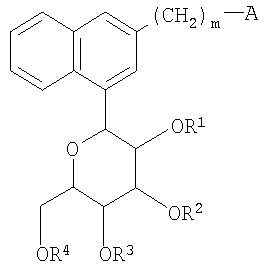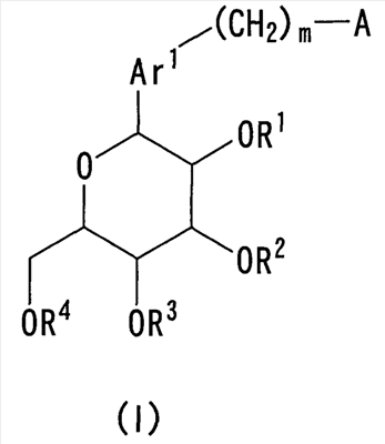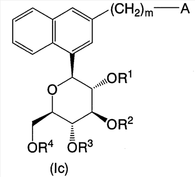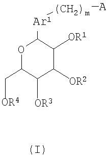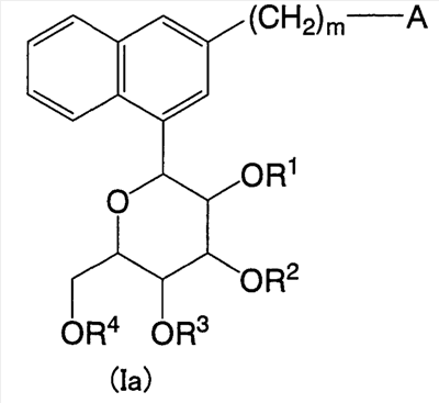 в которой m представляет собой целое число, выбранное из 1-3; каждый из R1, R2, R3 и R4 независимо выбирают из атома водорода и бензильной группы; Ar1 представляет собой нафтильную группу, которая может быть замещена одним или более заместителем, выбранным из группы, состоящей из C1-С6 алкильной группы или атома галогена; А представляет собой 5-7-членную ароматическую гетероциклическую группу, содержащую один или более гетероатомов, независимо выбранных из атома кислорода и атома серы, которая может образовывать конденсированный цикл с ароматическим карбоциклом или ароматическим гетероциклом, где А может быть замещена одним или более Rb, при условии, что, когда А является бензоконденсированным циклом, содержащим два или более колец, группа -(СН2)m– связана с гетероциклом в А; каждый из Rb независимо выбирают из C1-C6 алкильной группы, атома галогена и C1-С6-алкокси группы; или их фармацевтически приемлемым солям. Эти соединения используются в качестве ингибитора котраспортера Na+ и обладают способностью снижать уровень сахара в крови. Изобретение также относится к фармацевтической композиции на основе этих соединений, способу лечения и предупреждения таких заболеваний, связанных с гипергликемией, как диабет, осложнения диабета и ожирение. 4 н. и 7 з.п. ф-лы, 4 табл.