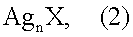 где в формуле 2 n равно целому числу от 1 до 4, X представляет собой кислород, серу, галоген, циано, цианат, карбонат, нитрат, нитрит, сульфат, фосфат, тиоцианат, хлорат, перхлорат, тетрафторборат, ацетилацетонат или карбоксилат (например, соединение серебра может представлять собой оксид серебра, тиоцианат серебра, сульфид серебра, хлорид серебра, цианид серебра, цианат серебра, карбонат серебра, нитрат серебра, нитрит серебра, сульфат серебра, фосфат серебра, перхлорат серебра, тетрафторборат серебра, ацетилацетонат серебра, ацетат серебра, лактат серебра, оксалат серебра или их производные. С учетом реакционной способности или последующей обработки предпочтительными являются оксид серебра или карбонат серебра, хотя настоящее изобретение ими не ограничивается).