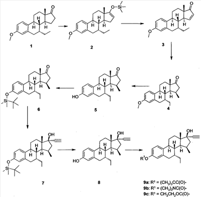 Благоприятное состояние сохранности эндометрия для патентуемых соединений изобретения является неожиданным, поскольку оба близкородственных соединения 17 Пример 4 Половое поведение самок крыс является гормонально зависимым. У эстроген-стимулированных самок крыс прогестерон значительно увеличивает половое поведение или реакции лордоза. Однако прогестерон неактивен, в том числе в отношении реакций лордоза, у овариэктомированных и не получавших эстроген самок (см. также J.B. Becker, S.M. Breedlove and D. Crews (Eds.) Behavioral Endocrinology, 1992, pp. 82-84). Способность тестируемых соединений стимулировать прогестерон-индуцированные реакции лордоза у овариэктомированных самок крыс была использована для демонстрации эстрогенной активности данных соединений in vivo при пероральном введении. В течение трех дней самки крыс получали тестируемые соединения, после чего на четвертый день им давали прогестаген. Половое поведение самок крыс исследовали через четыре часа после получения прогестерона в присутствии самцов крыс, регистрируя количество реакций лордоза в течение 10 минут. Для всех пролекарств типа Соединения 8, где R1 является пивалоилом (Соединение 9а), диметилкарбамоилом (Соединение 9b) или этоксикарбонилом (Соединение 9с), было продемонстрировано, что они являются активными эстрогеновыми соединениями при оральном введении в дозе 1 мг/кг.