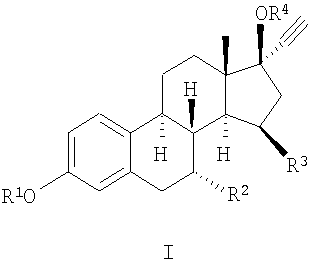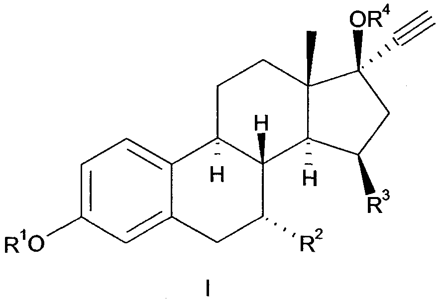 Пролекарства соединений G и H производные с свободными гидроксильными группами легко получаются с использованием таких известных в технологии реакций, как, например, ацилирование с использованием хлорангидридов карбоновых кислот в присутствии основания или ацилирование с использованием карбоновых кислот в присутствии конденсирующего агента, такого как дициклогексилкарбодиимид и т.д., с последующим удалением защитной силил-эфирной группировки в случае соединения G. Соединения Формулы I, имеющие группы, описанные в формуле изобретения 1, в которых R1 и R4 – атомы водорода, имеют стабильно более высокую селективность к подтипу Стероиды Формулы I, где R1 и R4 не являются (является) атомами водорода – пролекарства, необязательно отвечающие приведенным выше свойствам. Данные вещества в результате метаболических процессов в организме превращаются в соединения, в которых R1 и R4 – атомы водорода и которые отвечают приведенным выше характеристикам. Более того, селективные эстрогеновые лиганды данного изобретения, к удивлению, не вызывают повышения уровня пролиферации эндометрия (изменений, аналогичных фолликулярной фазе цикла) и, таким образом, могут быть использованы для (длительного) лечения и/или предотвращения пери- и/или постменопаузных (климактерических) состояний и остеопороза без добавления прогестагенных компонентов. Селективная активация рецепторов эстрогена представленными в данном изобретении соединениями делает их профиль подходящим для применения в терапии. Далее в данном изобретении рассматривается применение соединений, отвечающих Формуле I, для производства лекарственных средств, используемых для лечения и профилактики заболеваний, связанных с рецепторами эстрогена, или регуляции, лечения или предотвращения развития других физиологических состояний, связанных с рецепторами эстрогена. Следующий аспект изобретения касается использования соединений, отвечающих Формуле I, для производства лекарственных средств для гормональной заместительной терапии или гормонального лечения. Такое использование является особенно подходящим для женщин с проявлениями пери- и/или постменопаузных (климактерических) синдромов и остеопороза. Следующий аспект изобретения касается использования соединений, отвечающих Формуле I, для производства лекарственных средств для контрацепции. Данные соединения могут быть использованы в подобных целях как часть медикаментозного курса, включающего также соответствующие количества прогестагена. Подобные схемы хорошо известны в области контрацепции. Применение соединений, соответствующих изобретению, наиболее успешно достигает цели при получении лекарственных форм соответствующей дозировки. Данное изобретение также касается фармацевтического состава или дозированных форм, сочетающих соединение по изобретению, смешанное с (а) фармацевтически приемлемым(и) наполнителем(ями), такими, как описано в Gennaro et al., Remmington: The Science and Practice of Pharmacy 20th Edition, Lippincott, Williams and Wilkins, 2000; см. особенно часть 5: фармацевтическое производство. Подходящие наполнители описаны, например, в Handbook of Pharmaceutical Excipients, 2nd Edition; Editors A. Wade and P.J. Weller, American Pharmaceutical Association, Washington. Смесь соединения, соответствующего данному изобретению, и (а) фармацевтически приемлемых наполнителей может быть переведена в твердую форму, т