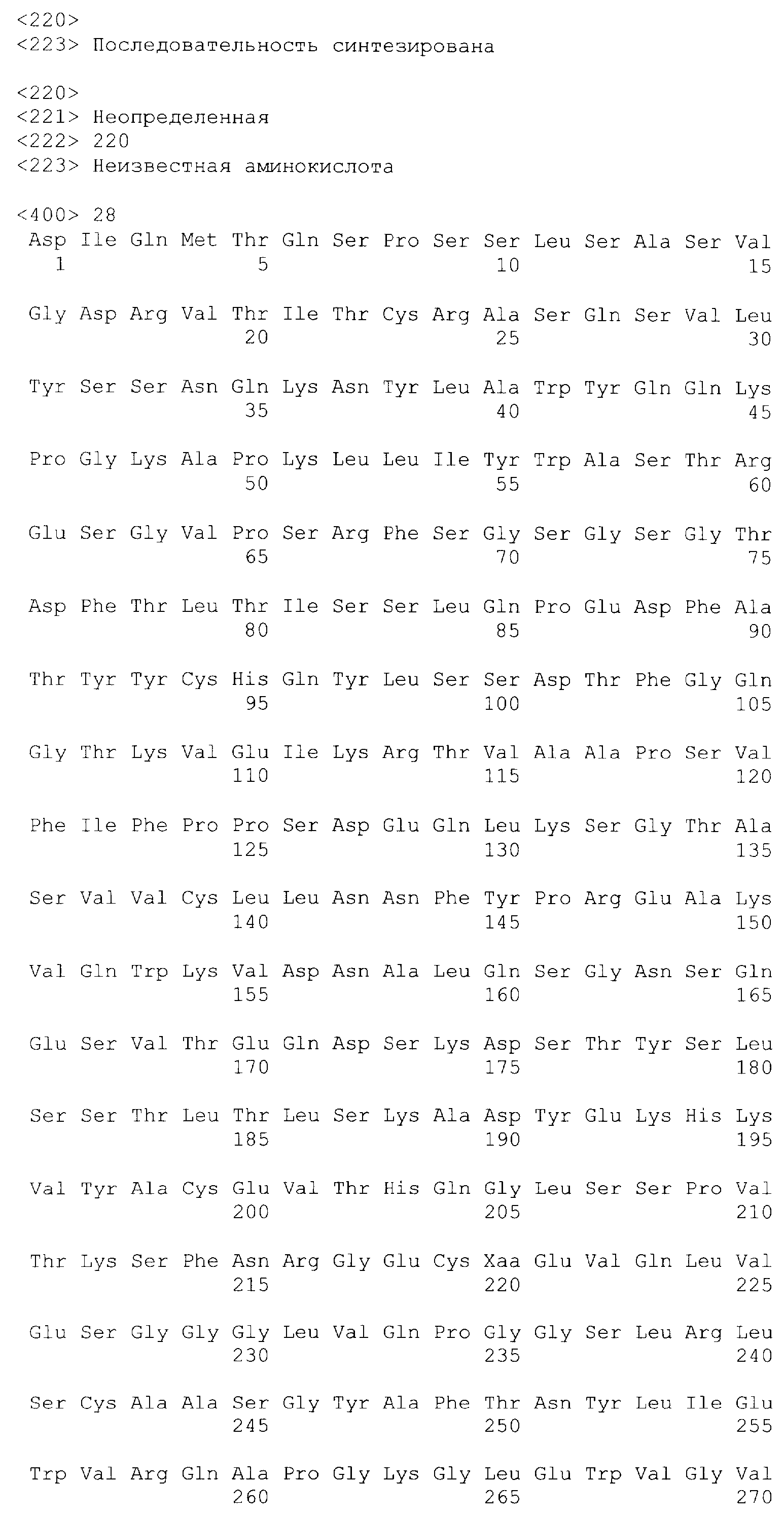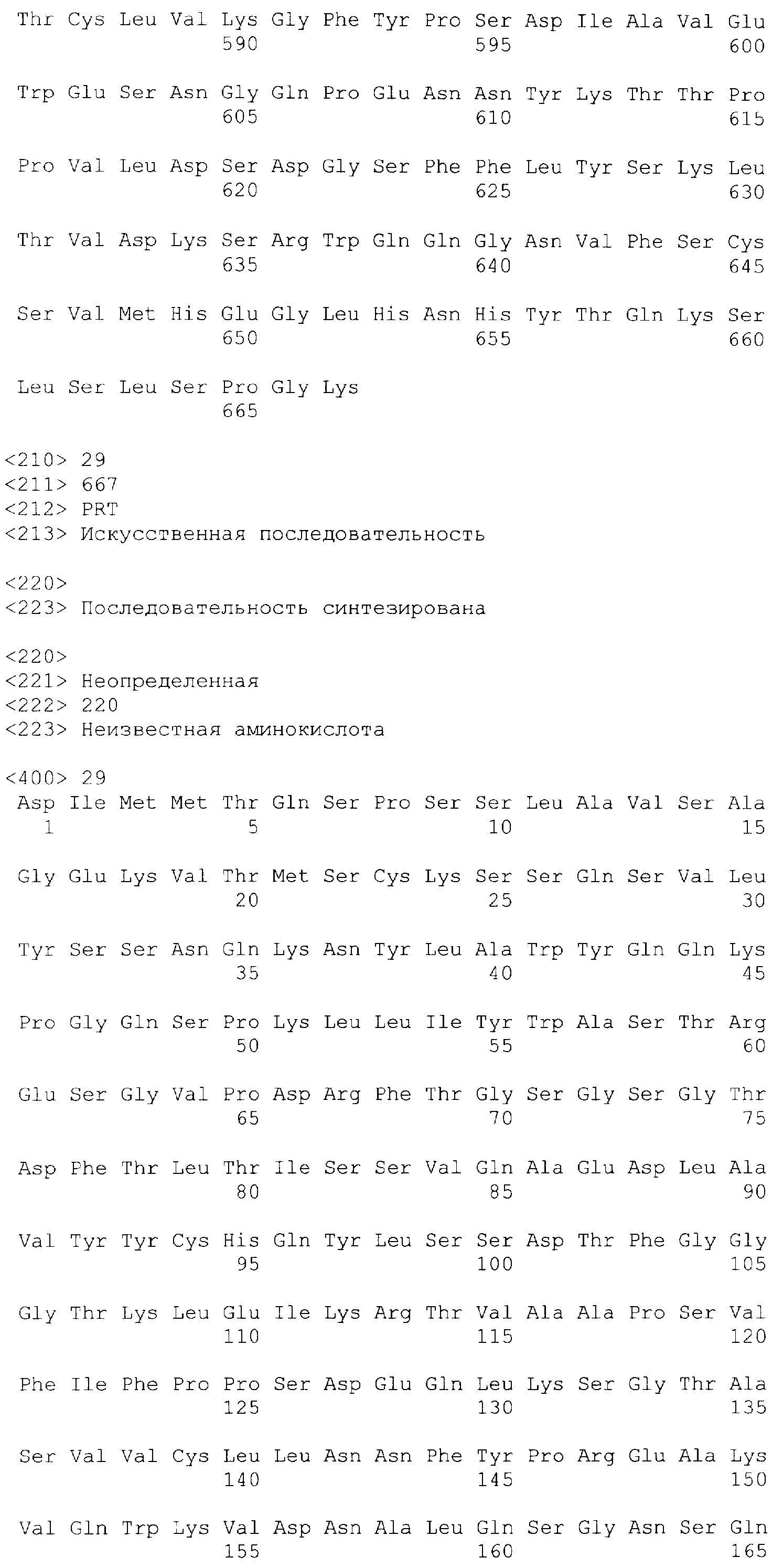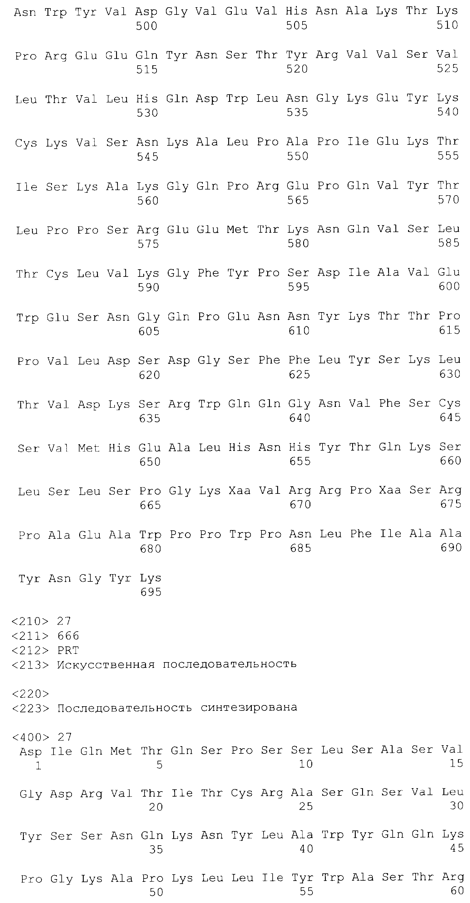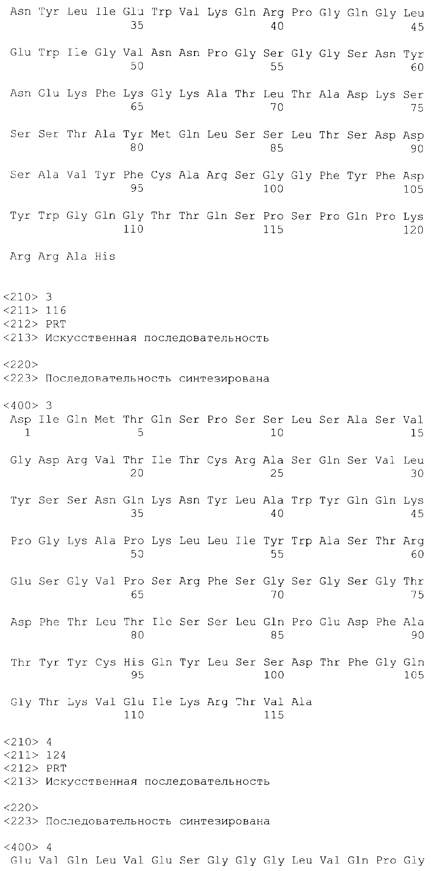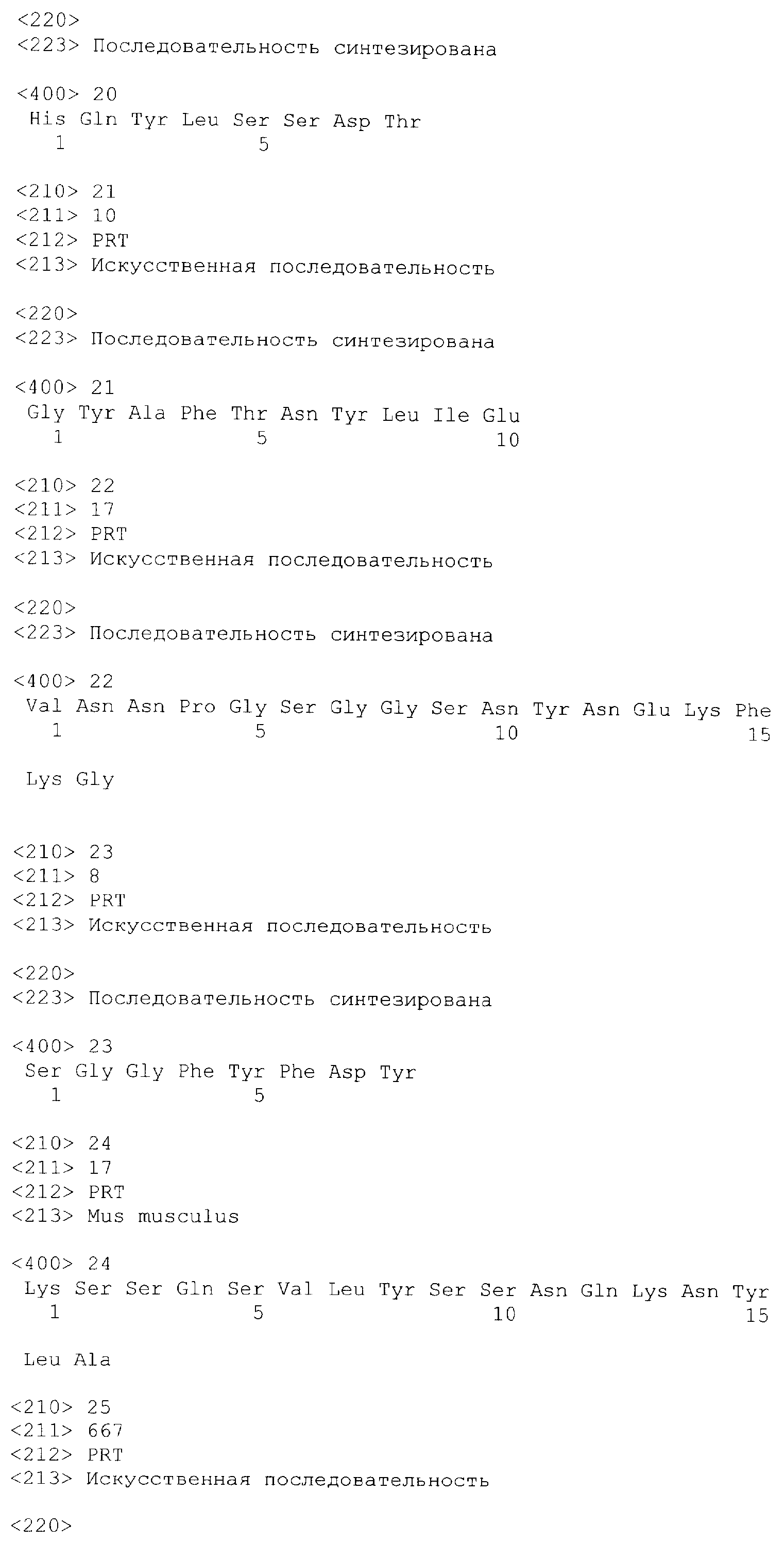 В еще одном предпочтительном варианте осуществления любое из антител, описанных выше, содержит остатки определяющего комплементарность участка (CDR) вариабельного домена легкой цепи (VL) RASQSVLYSSNQKNYLA (последовательность SEQ ID NO: 36); WASTRES (последовательность SEQ ID NO: 38) и HQYLSSDT (последовательность SEQ ID NO: 40) или содержит остатки CDR домена VL, где первый CDR (CDR L1) ревертирован в последовательность локуса каппа человеческой зародышевой линии L8/L9: RASQGISSYLA (последовательность SEQ ID NO: 37) и/или второй CDR (CDR L2) ревертирован в последовательность локуса каппа человеческой зародышевой линии L8/L9/L14/L15: YASSLQS (последовательность SEQ ID NO: 39). В еще одном предпочтительном варианте осуществления любое из антител, описанных выше, содержит остатки определяющего комплементарность участка вариабельного домена тяжелой цепи (VH) GYAFTNYLIE (последовательность SEQ ID NO: 41); VNNPGSGGSNYNEKFKG (последовательность SEQ ID NO: 42), или VINPGSGGSNYNEKFKG (последовательность SEQ ID NO: 43) и SGGFYFDY (последовательность SEQ ID NO: 44).