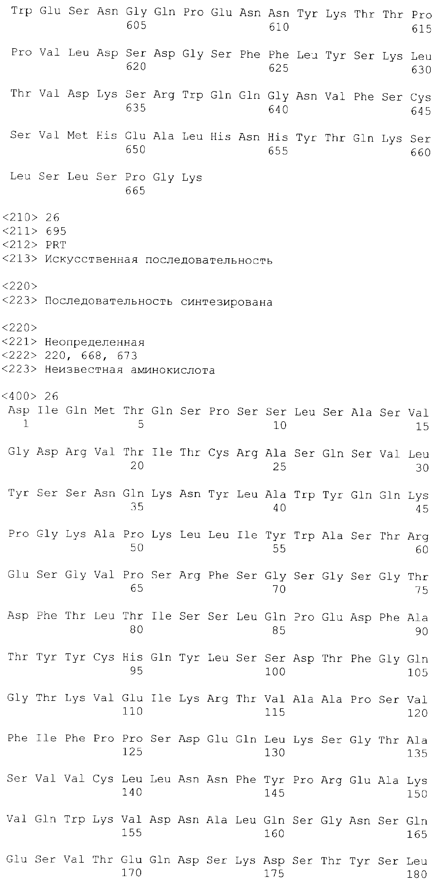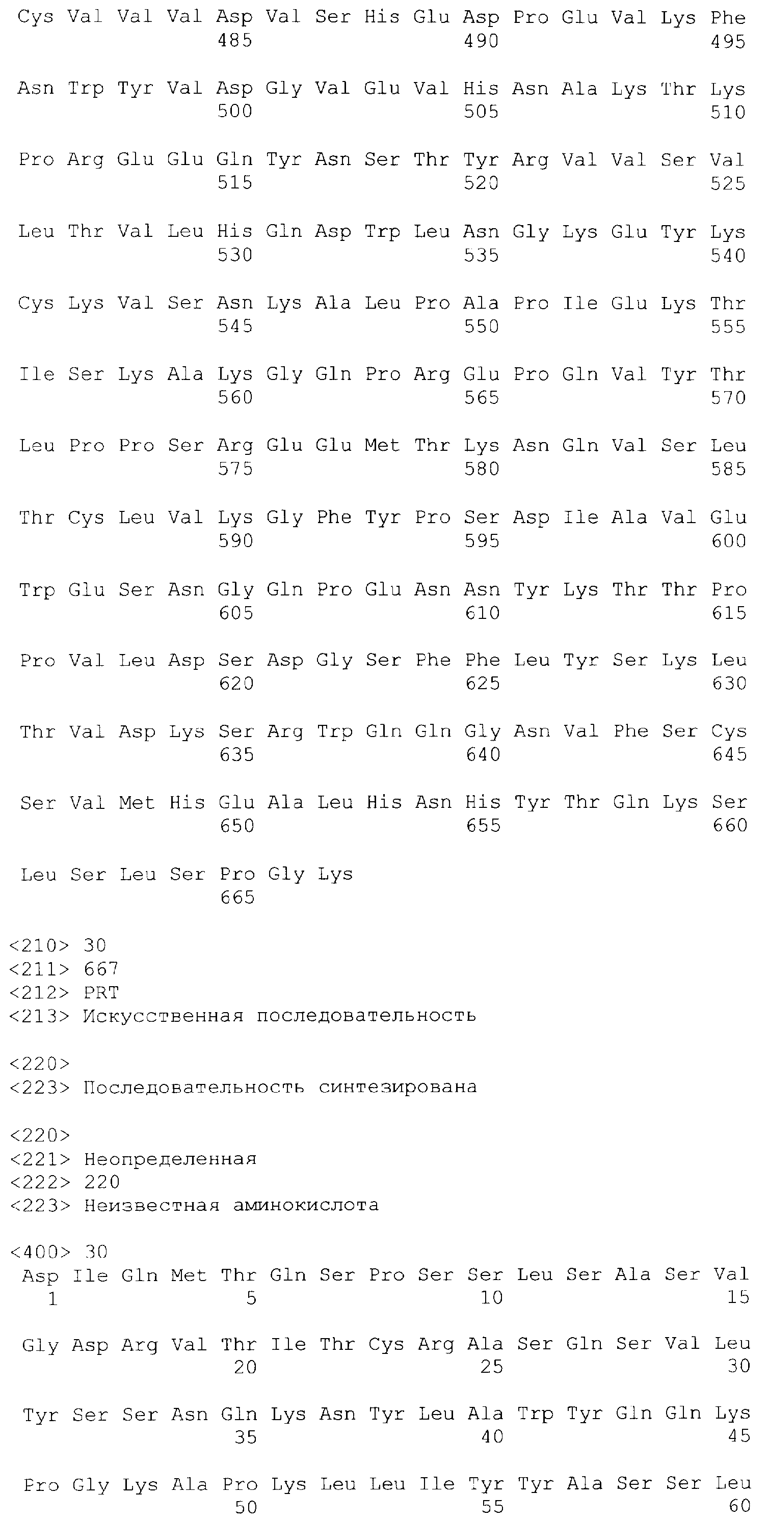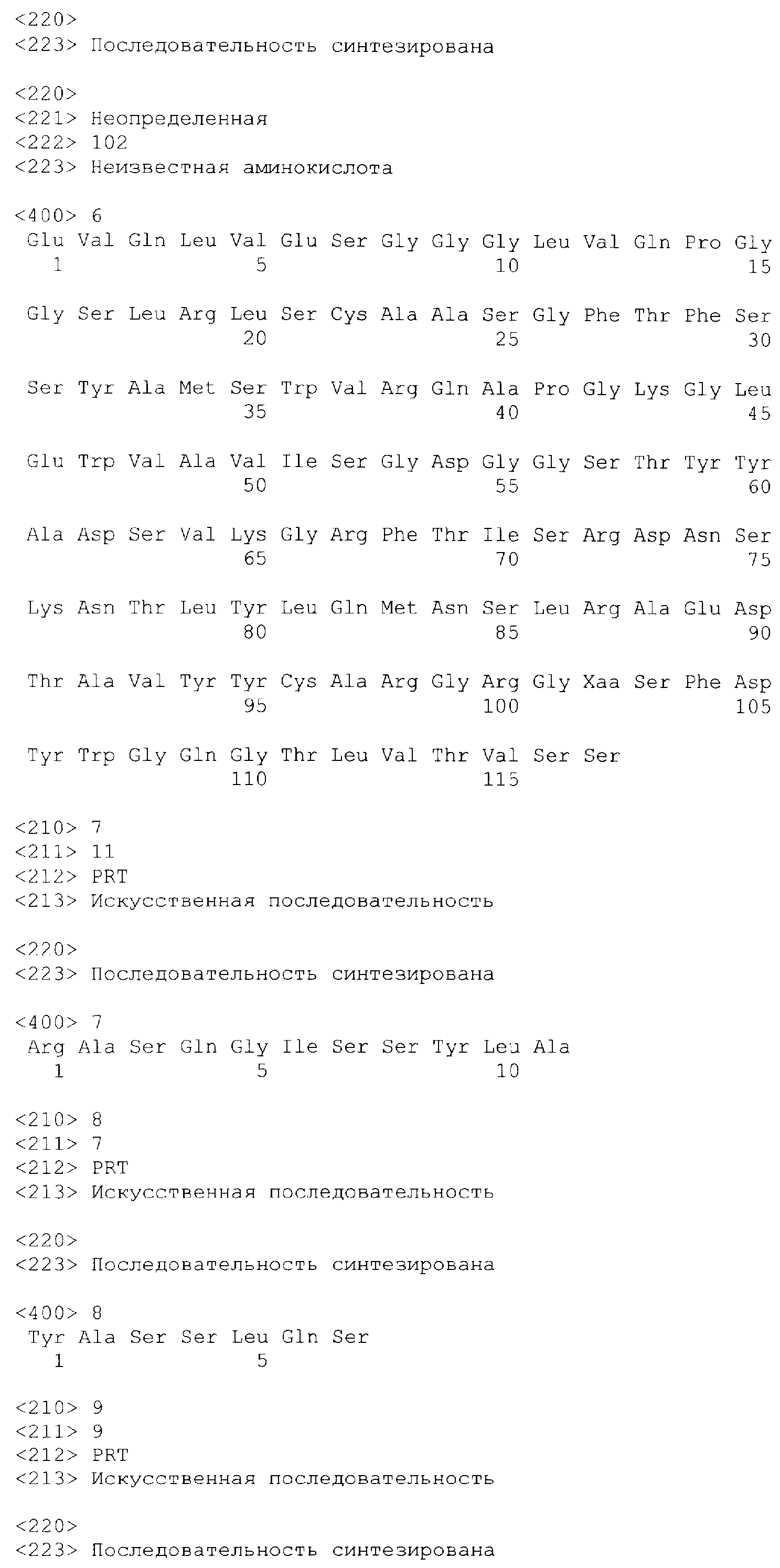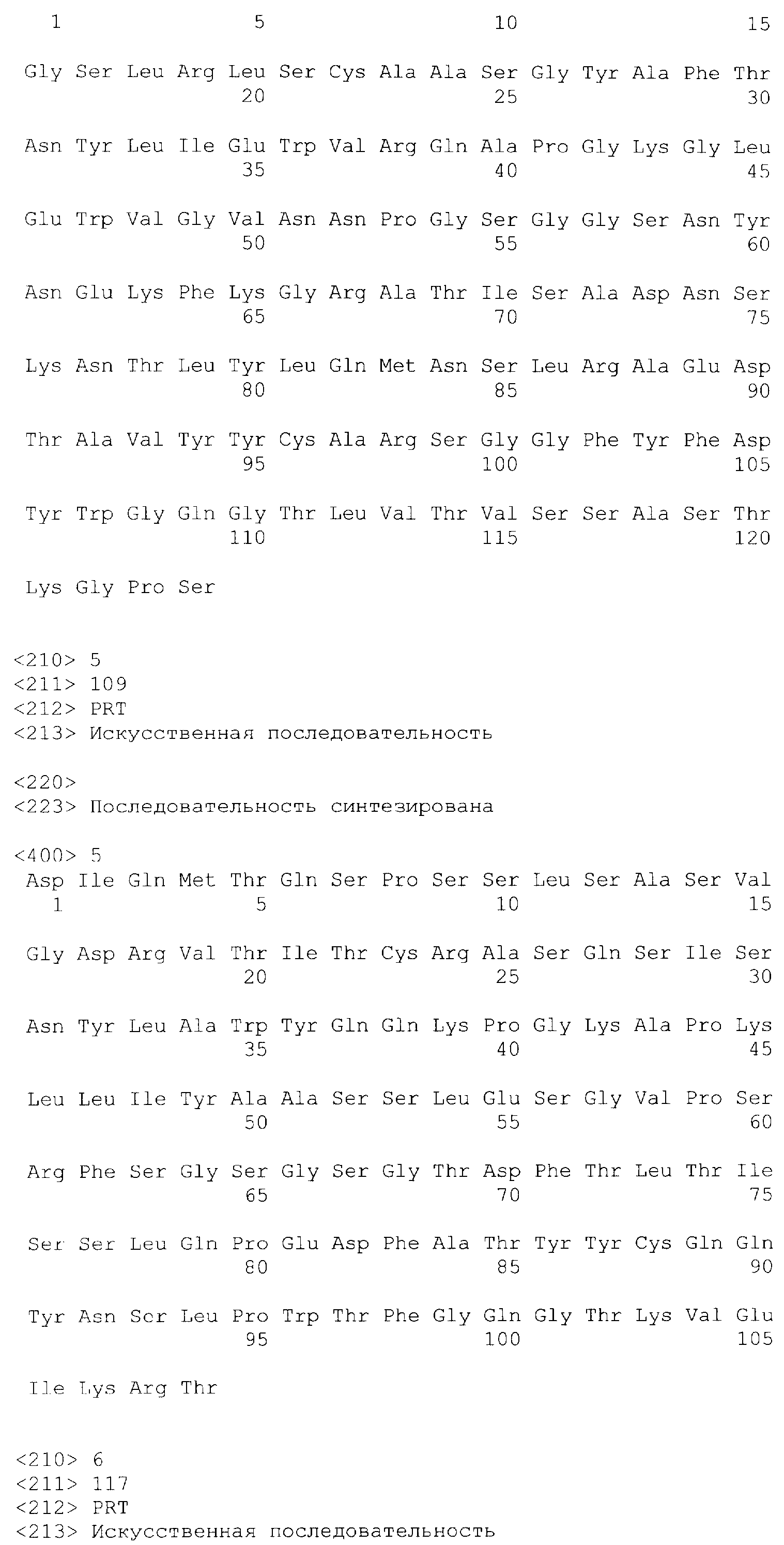 В еще одном предпочтительном варианте осуществления любое из антител, описанных выше, содержит остатки определяющего комплементарность участка (CDR) вариабельного домена легкой цепи (VL) RASQSVLYSSNQKNYLA (последовательность SEQ ID NO: 36); WASTRES (последовательность SEQ ID NO: 38) и HQYLSSDT (последовательность SEQ ID NO: 40) или содержит остатки CDR домена VL, где первый CDR (CDR L1) ревертирован в последовательность локуса каппа человеческой зародышевой линии L8/L9: RASQGISSYLA (последовательность SEQ ID NO: 37) и/или второй CDR (CDR L2) ревертирован в последовательность локуса каппа человеческой зародышевой линии L8/L9/L14/L15: YASSLQS (последовательность SEQ ID NO: 39). В еще одном предпочтительном варианте осуществления любое из антител, описанных выше, содержит остатки определяющего комплементарность участка вариабельного домена тяжелой цепи (VH) GYAFTNYLIE (последовательность SEQ ID NO: 41); VNNPGSGGSNYNEKFKG (последовательность SEQ ID NO: 42), или VINPGSGGSNYNEKFKG (последовательность SEQ ID NO: 43) и SGGFYFDY (последовательность SEQ ID NO: 44).