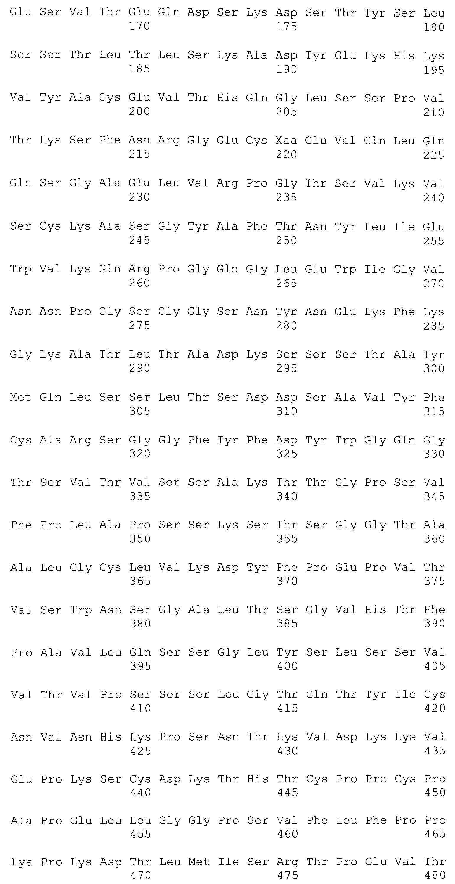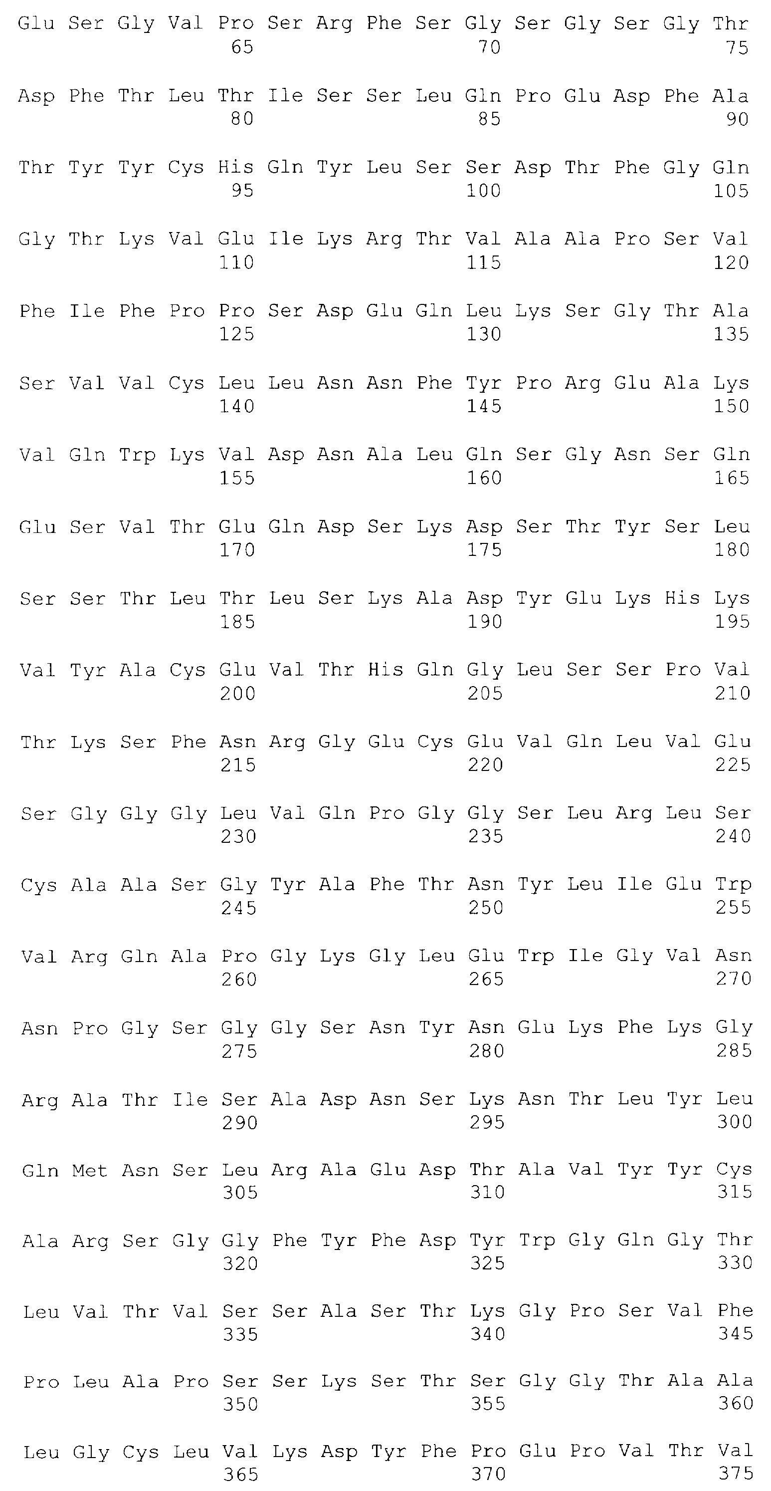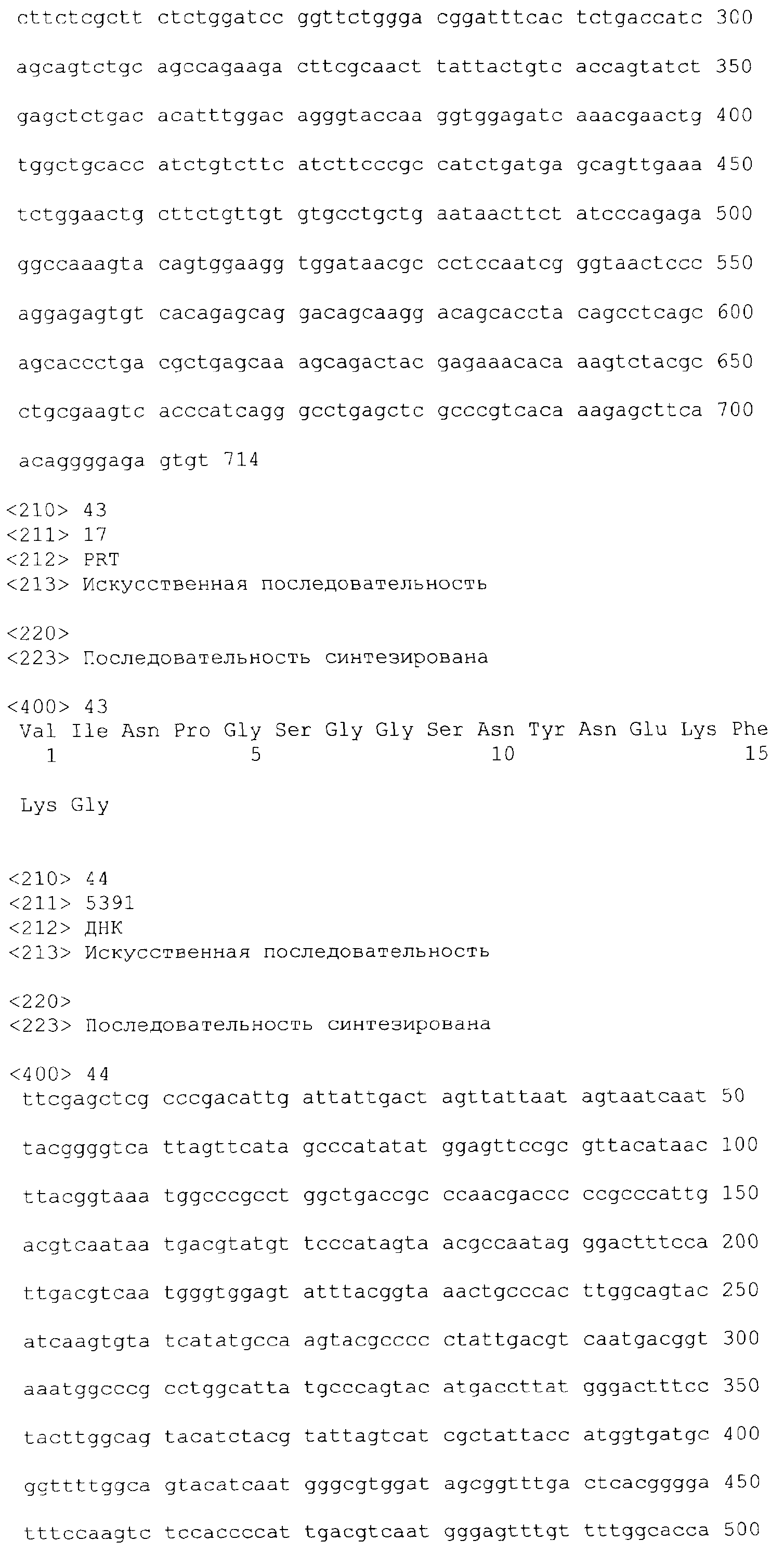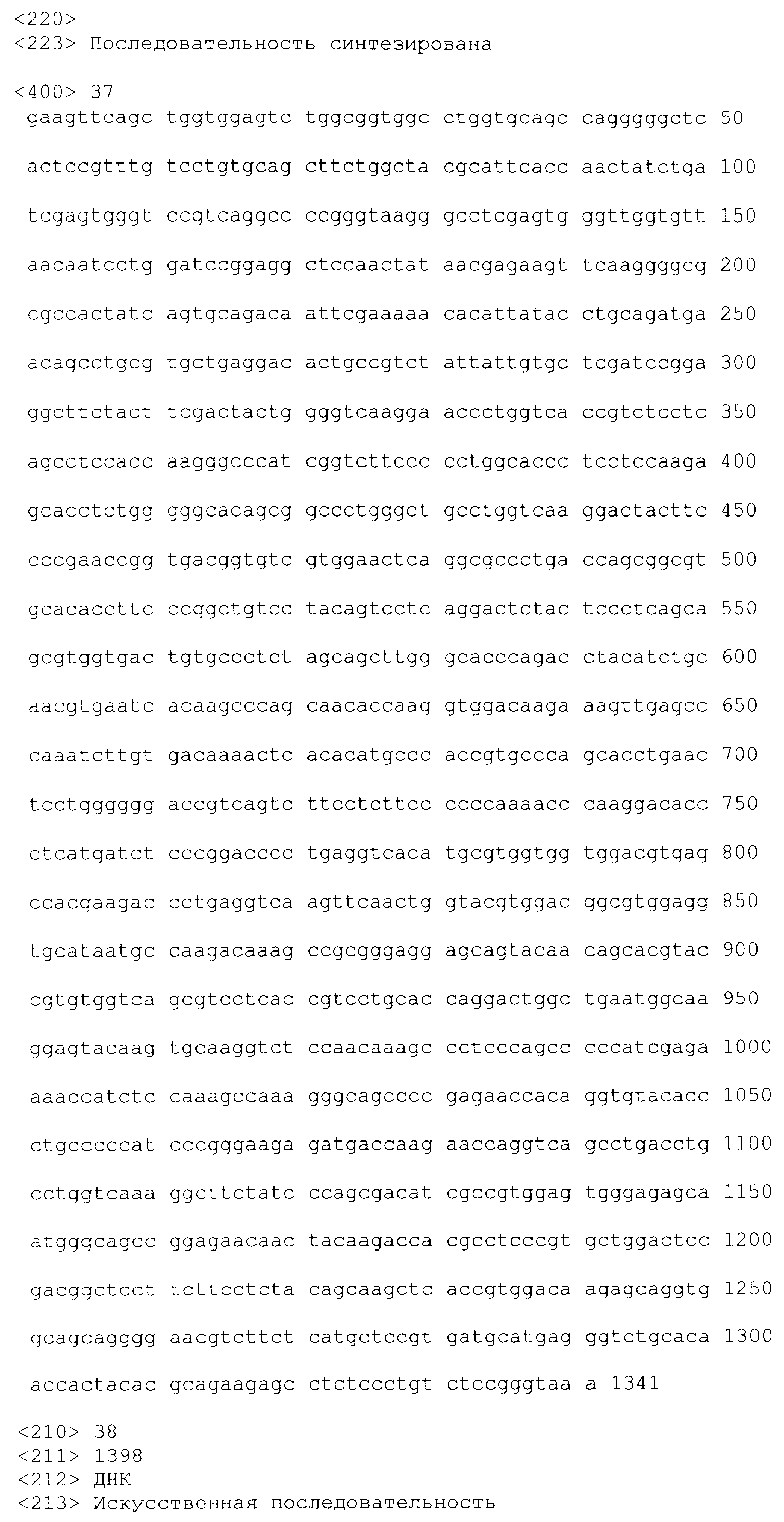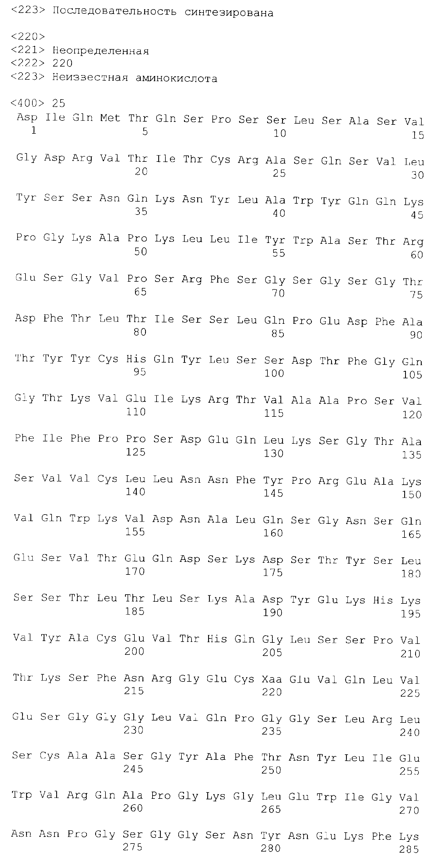 В еще одном предпочтительном варианте осуществления любое из антител, описанных выше, содержит остатки определяющего комплементарность участка (CDR) вариабельного домена легкой цепи (VL) RASQSVLYSSNQKNYLA (последовательность SEQ ID NO: 36); WASTRES (последовательность SEQ ID NO: 38) и HQYLSSDT (последовательность SEQ ID NO: 40) или содержит остатки CDR домена VL, где первый CDR (CDR L1) ревертирован в последовательность локуса каппа человеческой зародышевой линии L8/L9: RASQGISSYLA (последовательность SEQ ID NO: 37) и/или второй CDR (CDR L2) ревертирован в последовательность локуса каппа человеческой зародышевой линии L8/L9/L14/L15: YASSLQS (последовательность SEQ ID NO: 39). В еще одном предпочтительном варианте осуществления любое из антител, описанных выше, содержит остатки определяющего комплементарность участка вариабельного домена тяжелой цепи (VH) GYAFTNYLIE (последовательность SEQ ID NO: 41); VNNPGSGGSNYNEKFKG (последовательность SEQ ID NO: 42), или VINPGSGGSNYNEKFKG (последовательность SEQ ID NO: 43) и SGGFYFDY (последовательность SEQ ID NO: 44).