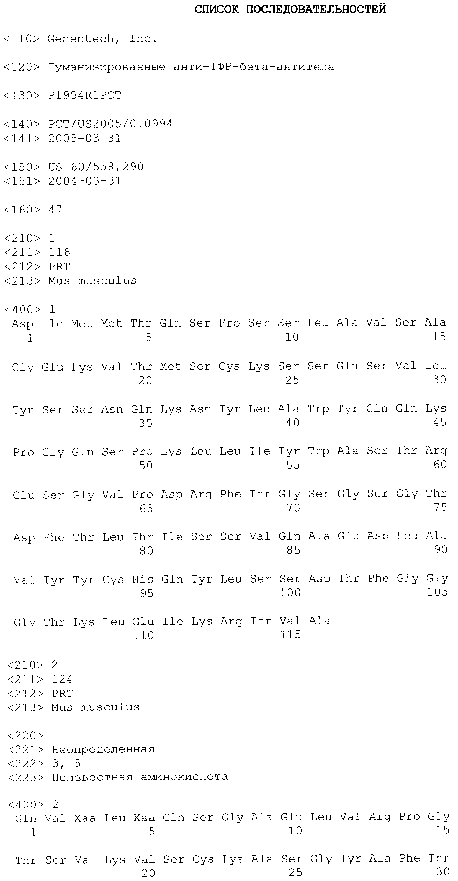 Другие применения, где антитела против ТФР-бета показали обнадеживающую терапевтическую эффективность, включают применение антител против ТФР-бета для лечения глазных заболеваний, включая фиброз глаз, в том числе пролиферативную ретинопатию (Pena et al., Invest. Ophthalmology Vis. Sci., 35: 2804-2808 (1994)), профилактику катаракты (WO 1995/13827), отслоение сетчатки и уренирование после операции по поводу глаукомы (Khaw et al., Eye, 8: 188-196 (1994)). Connor et al., J. Clin Invest., 83: 1661-1666 (1989) показали, что значительно более высокие концентрации ТФР-бета2 имелись в аспиратах стекловидного тела от пациентов с внутриглазным фиброзом, связанным с пролиферативной ретинопатией, по сравнению пациентами с неосложненным отслоением сетчатки без фиброза глаз и что биологическую активность данного ТФР-бета2 можно нейтрализовать антителами против ТФР-бета2.