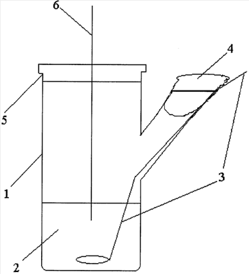 Установка содержит двугорлый сосуд 1, выполненный из стекла пирекс и заполненный ниже уровня боковой горловины плотной питательной средой 2, застывшей в виде столбика. В питательную среду на дно сосуда помещен электрод 3, выполненный в виде петли из проволоки, загнутой кольцом, токоотвод которого выведен через боковую горловину сосуда. Боковая горловина закрыта ватно-марлевой пробкой 4, которая должна плотно прижимать токоотвод к стенке сосуда, но при этом не затруднять снабжение культуры воздухом. Верхняя горловина сосуда плотно закрыта пробкой из термостойкой пищевой резины 5. Через эту пробку введена бактериологическая игла 6, представляющая собой металлическую проволоку диаметром 0,5-1 мм. Игла является вторым электродом и опущена в столбик с питательной средой в верхней его части. Для изготовления электродов можно использовать хромоникелевую проволоку, а также проволоку из нержавеющей стали, платины, вольфрама.