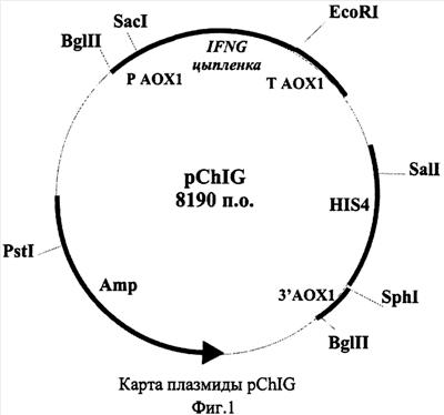 1. Рекомбинантная плазмида pChIG, обеспечивающая биосинтез гамма-интерферона цыпленка, имеющая размер 8,19 т.п.о. и состоящая из следующих элементов: EcoRI-BamHI – фрагмента плазмидной ДНК бифункционального бактериально-дрожжевого вектора pPIC9 размером 7,75 т.п.о., включающего бактериальный ген устойчивости к ампициллину, бактериальную область инициации репликации, ген HIS4 дрожжей; фрагмент 5′-некодирующей области дрожжевого гена АОХ1 размером 0,95 т.п.о., содержащий область, обеспечивающую активацию транскрипции этого гена в присутствии метанола в качестве источника углерода в культуральной среде; фрагмент гена АОХ1 размером 0,33 т.п.о., содержащий область терминации транскрипции этого гена; фрагмент 3′-нетранслируемой области гена АОХ1 размером 0,76 т.п.о.; BglII-EcoRI – фрагмент размером 0,44 т.п.о., содержащий кодирующую часть гена гамма-интерферона цыпленка, за исключением области, кодирующей сигнальный пептид, где ген гамма-интерферона цыпленка получен способом обратной ПЦР-реакции, матрицей для которой служит РНК, полученная из мононуклеаров периферической крови курицы, индуцированных рекомбинантным интерлейкином-2 человека “Ронколейкин” ®.