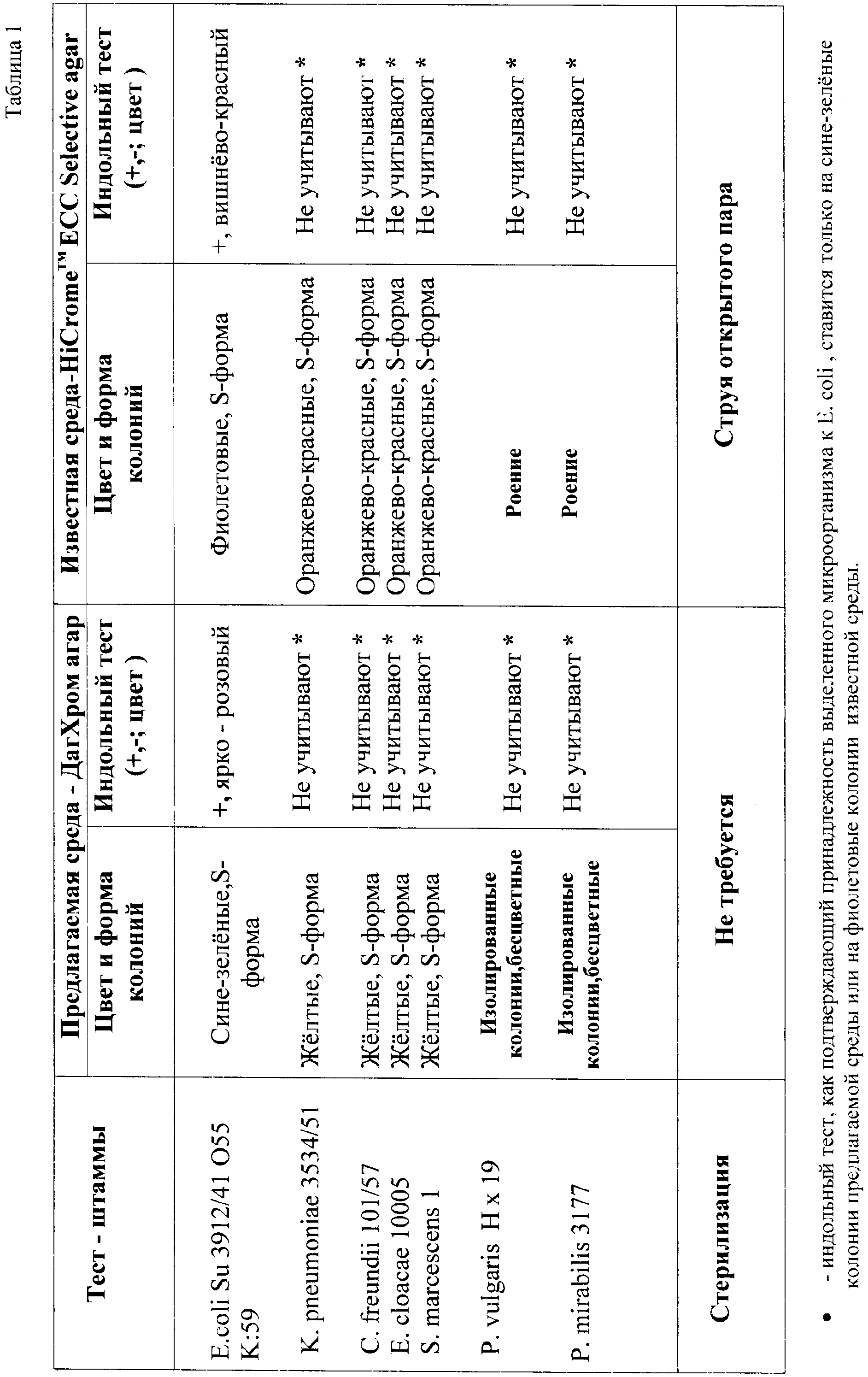 Изобретение относится к медицине, а именно к санитарной и клинической микробиологии, и может быть использовано при исследовании различного материала с подозрением на кишечную палочку и другие колиформные бактерии. Проблема острых кишечных инфекций (ОКИ) чрезвычайно актуальна в современной медицине, о чем свидетельствуют спорадические вспышки тех или иных острых кишечных заболеваний. Источником заражения ОКИ являются инфицированные объекты внешней среды – питьевая вода, воды открытых водоемов, предметы обихода, пищевые продукты и их компоненты, особенно промышленного изготовления. В связи с тем, что ОКИ являются заболеваниями с фекально-оральным путем передачи инфекции, важное значение для предупреждения заболевания имеет регулярный санитарно – эпидемиологический надзор за объектами внешней среды, включающий в себя микробиологические исследования окружающей среды и пищевых продуктов с целью оценки их безопасности для здоровья человека. Для предупреждения внутрибольничных инфекций (ВБИ) также проводят регулярные санитарно-микробиологические исследования на обсемененность в лечебно-профилактических учреждениях: смывы с различных объектов стационара, инструментов, пищеблока и т.п. Согласно действующим Методическим указаниям по проведению санитарно-микробиологического анализа питьевой воды (МУК 4.2.1018-01) и микробиологическому контролю продуктов питания и их компонентов (МУК 4.2.577-96) в исследуемом материале проводят определение бактерий группы кишечной палочки (БГКП), так называемых общих колиформных бактерий, как санитарно – показательных микроорганизмов, к которым в соответствии с принятой международной номенклатурой относят грамотрицательные неспорообразующие палочки, сбраживающие лактозу с образованием кислоты и газа при температуре (37±1)°С в течение 24-48 ч и являющиеся представителями родов Escherichia, Citrobacter, Enterobacter, Klebsiella и Serratia, т.е. учитываются как цитратотрицательные, так и цитратположительные варианты БГКП.Наличие БГКП в исследуемом образце характеризует общее микробное загрязнение. Индикатором свежего фекального загрязнения и косвенным показателем возможного загрязнения патогенными возбудителями кишечных инфекций является непосредственное присутствие в исследуемом материале E.coli – неутилизирующих цитрат, грамотрицательных бесспоровых палочек, способных расти и ферментировать лактозу при температурах выше температуры человека и теплокровных животных (44-44,5)°С. Известны питательные среды для санитарно-микробиологических исследований объектов внешней среды (1, 2, 3, 4, 5). К недостаткам указанных сред следует отнести их слабые дифференцирующие свойства из-за сходства биохимических реакций колиформных бактерий (БГКП) по отношению к лактозе, вследствие чего все колонии БГКП идентично окрашиваются. Кроме того, существенным недостатком традиционных сред Эндо и Левина является неспособность их подавлять роение протеев: в случае присутствия в микробной ассоциации роящихся форм протея выделение возбудителя в чистой культуре невозможно, что препятствует дифференциации и идентификации микроорганизмов. По этим причинам для выявления свежего фекального загрязнения требуется обязательная постановка дополнительных идентификационных тестов – температурного, индольного, реакции с метиловым к