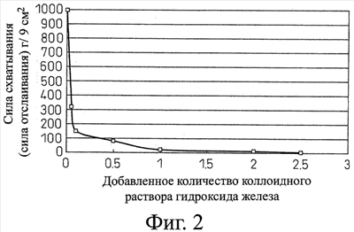 Такой же порядок эксперимента, как в примере 2, применяют для измерения устойчивости к отжигу, когда изменяют количество добавки раствора коллоидного гидроксида железа (10 нм) относительно 100 мл основного раствора первичного фосфата Аl; 25 мл + первичный фосфат Mg; 25 мл+20% коллоидный диоксид кремния (7 нм) в молярном соотношении относительно фосфата от 0 до 2,5. Результаты показаны на фиг.2. Добавлением 0,06 моль или более гидроксида железа на 1 моль фосфата сила отслаивания может быть значительно уменьшена.