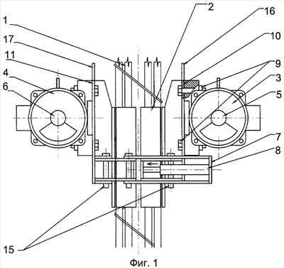 Опорные пластины 10 и 11 снабжены крепежными отверстиями 12, 13, 14, которые позволяют устанавливать вибровозбудители 3 и 4 симметрично относительно плоскости разъема захвата 2, при этом оси вращения дебалансных валов 5 и 6 могут быть либо параллельны, либо перекрещиваться под углом от 45 до 90 градусов (фиг.3).