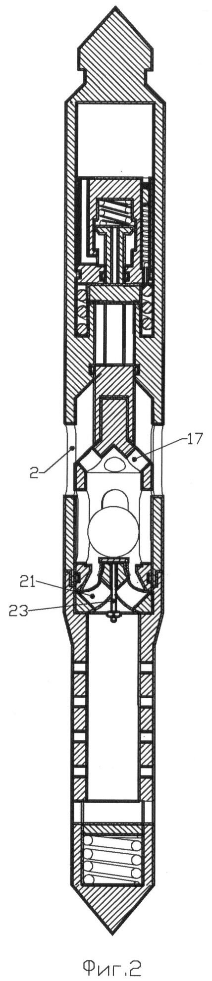 Выполненный в ступенчатом поршне канал, сообщающий выход с кольцевого клапана с областью пониженного давления камеры, и герметично выполненная и заполненная нейтральной жидкостью камера позволяют отделить находящиеся в ней элементы от пластовой жидкости и обеспечить их надежную работу.