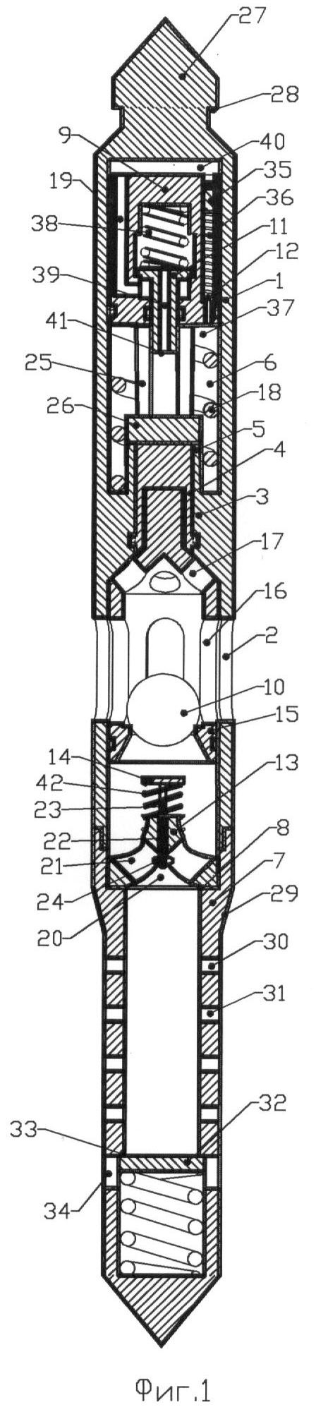 Но если забойное давление будет снижено настолько, что разность гидростатического и забойного давления будет превышать давление срабатывания, на которое было настроено устройство перед спуском, то перепускной клапан 12 откроется. Жидкость из области 37 начнет перетекать в область 40 камеры 6, соответственно это вызовет медленное перемещение полого ступенчатого поршня 9 и клапанной клетки 15 вниз. Медленное перемещение ступенчатого поршня 9 и клапанной клетки 15 вниз продолжается до взаимодействия подпружиненного кольцевого клапана 11 с упорной пластиной 26, жестко закрепленной с корпусом 1. При взаимодействии торец 41 кольцевого подпружиненного клапана 11 упирается в упорную пластину 26 и подпружиненный кольцевой клапан 11 откроется. Жидкость из области 37 камеры 6 начнет быстро перетекать в область 40 камеры 6 по центральному каналу 39 и каналу 19. Соответственно ступенчатый полый плунжер 9 и клапанная клетка 15 начнут быстро перемещаться с ускорением вниз. При этом шаровой клапан 10 в закрытом состоянии достигает опорной подпружиненной площадки 14, перемещая ее, сжимает пружину 42 и, достигнув упора 13, открывается. На фиг 2 изображено устройство в этом положении. Из-за высокой скорости перемещения клапанной клетки 15 вниз открытие шарового клапана 10 произойдет практически мгновенно и жидкость под действием разности давления гиростатического и забойного начнет перемещаться через радиальные каналы 2 корпуса 1, верхние каналы 17 клапанной клетки 15, сквозные угловые каналы 21 упора 13, сквозные радиальные отверстия 31 фильтра 30, очищая фильтр. Имульс созданного давления воздействует также подпружиненный поршень 32, который перемещаясь открывает каналы большего диаметра 34, и далее жидкость в форме импульса давления и расхода воздействует на пласт. Так как гидравлическое сопротивление потоку жидкости через устройство значительно меньше, чем фильтрационное сопротивление пласта, давление жидкости над и под устройством выравниваются. Под действием пружины 42 опорная подпружиненная площадка 14 будет удерживать шаровой клапан 10 в открытом состоянии до установленного гайкой 24 ограничения, при подъеме клапанной клетки 15 под действием возвратной пружины 18 выше данного ограничения шаровой клапан 10 закроется. Таким образом, момент закрытия шарового клапана 10 можно регулировать гайкой 24. Давление над шаровым клапаном 10 начнет возрастать, и на клапанную клетку 15 и ступенчатый поршень 9 начнет действовать усилие по перемещению их вниз. Когда данное усилие превысит действие возвратной пружины 18, перемещение верх клапанной клетки 15 и ступенчатого поршня 9 прекратится, и если разность давления над и под устройством будет также превышать давление срабатывания, то клапанная клетка 15 и ступенчатый поршень 9 начнут медленно перемещаться вниз для создания нового импульса. Таким образом, устройство будет многократно генерировать импульсы мгновенных давлений и расходов, пока разность давлений над и под устройством будет превышать давление срабатывания устройства. Причем продолжительность импульса зависит от ограничения перемещения опорной площадки, которая регулируется гайкой 24.