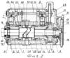 На валах 5 и 6 жестко закреплены цилиндрические шестерни 9 и 10, находящиеся в постоянном зацеплении друг с другом, а также с шестернями 11, укрепленными на газораспределительных валах 12 и 13.