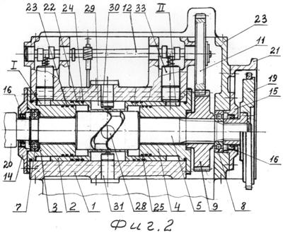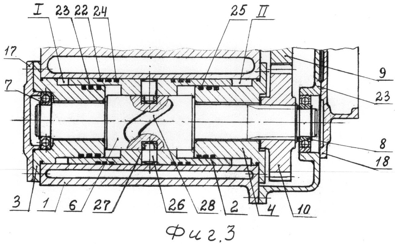 В средней части поршней 2 жестко закреплены оси 26, а на них подвижные ролики 27, контактирующие с боковыми поверхностями бесконечного зигзагообразного паза 28, выполненного на цилиндрической поверхности главного 5 и дополнительного валов 6.