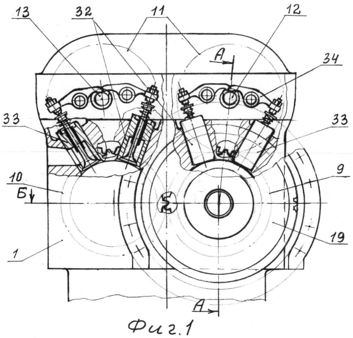 Сущность изобретения поясняется чертежами, где на Фиг.1 изображен двигатель – вид с маховика; на Фиг.2 – вид А-А на Фиг.1; на Фиг.3 – вид Б-Б на Фиг.1; на Фиг.4: