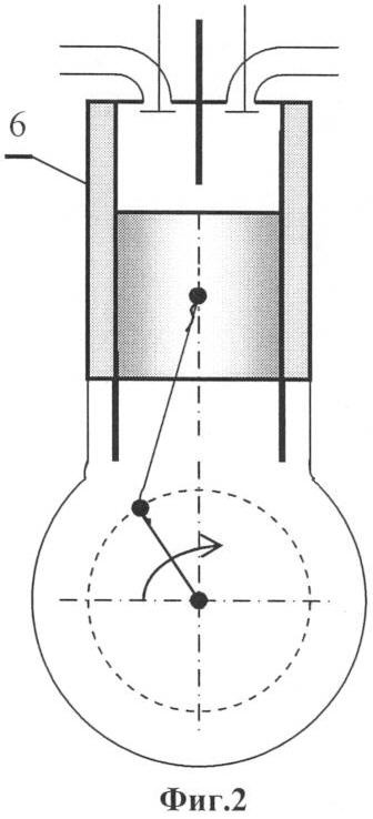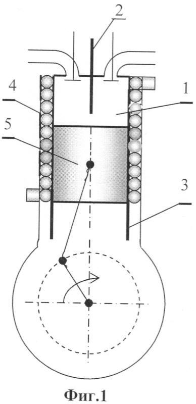 На фиг.1 представлена схема устройства. В камере сгорания 1 двигателя внутреннего сгорания поле коронного разряда создает помещенный на оси цилиндра двигателя тонкий металлический стержень (тонкая проволока) 2, являющийся положительным электродом (анодом) с напряжением 5,5-6,8 кВ. Роль противоположного электрода играет заземленный цилиндр 3. Магнитное поле создается соленоидом 4, навитым на цилиндр двигателя, в котором движется поршень 5.