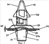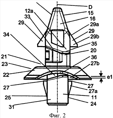 Верхняя часть содержит два поперечных выступа 29. Согласно одному из вариантов выполнения, выступы 29 выступают из боковых поверхностей верхней части 12 наклонным участком 29а и поперечным участком 29b. Наклонный участок 29а проходит в направлении язычка 13 верхней части 12, приближаясь к оси D.