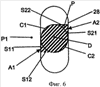 Согласно фиг.6 протяженный корпус 10, связывающий основание 11 и поперечный диск 21, поддерживающий кольцевой фланец 22, имеет сечение, образованное двумя дугами в четверть окружности С1 и С2, симметричными относительно оси D протяженного корпуса 10 и связанными двумя прямыми углами А1 и А2. Две четверти окружности С1 и С2 принадлежат своему кругу с конструкцией Р, диаметр которого является несколько меньшим ширины отверстия 28 первой пластины Р1. Участок протяженного корпуса 10, связывающий основание 11 с поперечным диском 21, имеет две упорные поверхности S11 и S12, расположенные под прямым углом А1, и две упорные поверхности S21 и S22, расположенные под прямым углом А2. Упорные поверхности S11 и S21 входят одновременно в контакт со стенками отверстия 28 для воспрепятствования вращения протяженного корпуса 10 в первом положении (представленном на фиг.6), аналогично упорные поверхности S12 и S22 входят одновременно в контакт для воспрепятствования вращения протяженного корпуса во втором положении (не показано). Разрешенный угловой ход протяженного корпуса между первым и вторым положениями составляет четверть оборота. Согласно одному из вариантов выполнения, после этапа предварительного взаимного соединения пластин Р1 и Р2 упорные поверхности S12 и S22 упираются в стенку отверстия 28 для блокирования движения протяженного корпуса 10 против часовой стрелки. И наоборот, вращение протяженного корпуса по часовой стрелке является санкционированным и направленным благодаря четвертям окружности С1 и С2 вплоть до достижения контакта с упорными поверхностями S11 и S21. В этом положении соединение блокируется или фиксируется и движение по часовой стрелке прекращается.