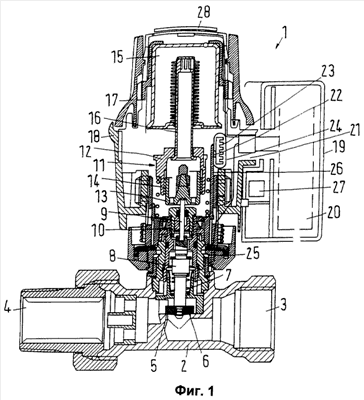 Основной элемент 18 установлен на опоре 25, прикрепляемой к корпусу 2 клапана. Такое крепление может быть осуществлено, например, в виде зажима или резьбового соединения. От опоры отходит держатель 26, выполненный из теплопроводящего материала, например меди. Держатель 26 соединен с генератором 22 с другой его стороны. Поэтому на генератор 22 действует разность температур, т.е. разность между температурой корпуса 2 клапана и протекающего через него теплоносителя, с одной стороны, и температурой в помещении, с другой стороны. Эта разность температур может достигать нескольких десятков градусов, так что с ее помощью можно обеспечить электрическую мощность достаточной величины. В случае необходимости держатель 26 в остальных местах можно изолировать от внутренних частей основного элемента 18. Благодаря этому уменьшается термическое влияние на термостатический элемент 15 и снижается падение разности температур между корпусом 2 клапана и генератором 22. Во многих случаях предпочтительно предусмотреть термическую изоляцию между держателем 26 и термостатическим элементом 15, например, в виде экрана (подробно не показан).