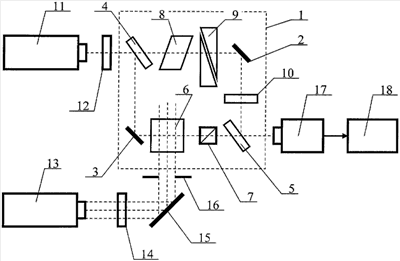 Две коллинеарных плоских волны света – сигнальная с широкой полосой и опорная с частотой, равной центральной частоте спектра сигнальной волны, воздействуют на КРТ фотоприемное малошумящее устройство 17. При этом на его выходе образуется широкополосный видеосигнал, который линейно представляет спектр мощности излучения импульсного ОКГ 13. Известно, что при гомодинном и гетеродинном режимах фотосмешения реализуется принцип синхронного детектирования, которое является линейной операцией. Эти режимы фотосмешения широко используются в лазерной локации [15-17].