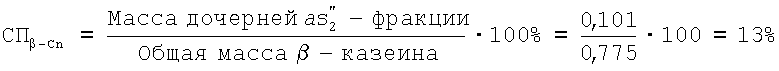 Способ определения зрелости твердых сычужных сыров, включающий качественный и количественный электрофоретический анализ продуктов распада (протеолиза) казеиновых фракций в сырах, отличающийся тем, что зрелость каждого сыра определяют по степени протеолиза s1-, -, и -фракций казеина, для чего проводят электрофорез в полиакриламидном геле, вычисляют степень протеолиза s1-, -, и -казеинов по процентному отношению массы их вновь образованных дочерних фракций: , , 1 и 3 к общей массе соответствующей фракции казеина, которое имеет строго индивидуальную величину у каждого вида сыра при наступлении его зрелости.