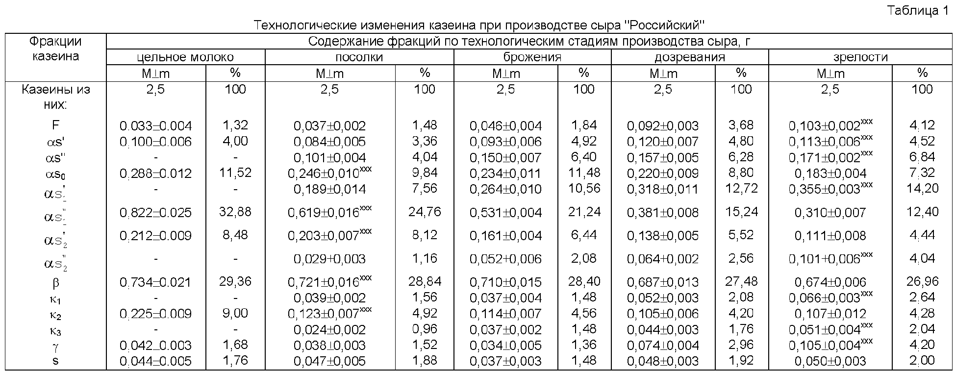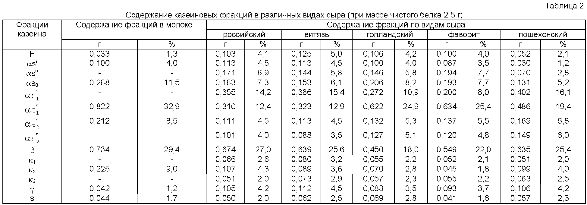 Технический результат достигается путем проведения качественного и количественного анализа белков зрелого сыра, используя метод электрофореза в полиакриламидном геле по методике, разработанной Р.А.Хаертдиновым (1989; 1999). Качественный анализ предусматривает выявление и идентификацию белковых фракций в сырах. При электрофорезе белков разных видов зрелого сыра выявляются 14 фракций казеина, из них 5 являются вновь образованными и отсутствуют в цельном молоке (см. чертеж). Из новых фракций наибольший интерес представляют , , 1– и 3-фракции: первая является продуктом протеолиза s1-казеина, вторая – -казеина, третья и четвертая – -казеина. Новые дочерние фракции появляются на стадии формования сыра, и в дальнейшем их концентрация в сыре неуклонно возрастает, а истинных фракций, напротив, снижается, что характеризует процесс созревания сыра (табл.1). Процесс распада наиболее глубоким является у главного белка – s1-казеина.