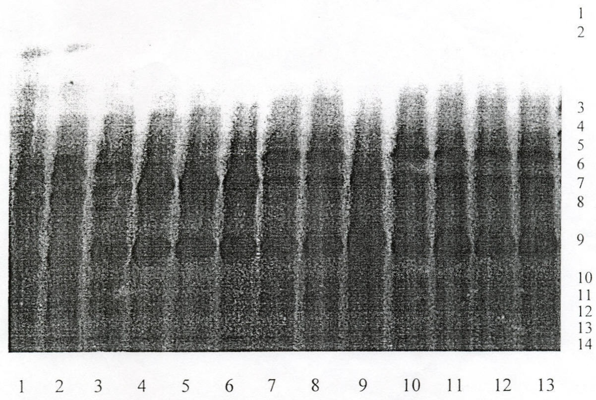 На чертеже – Фореграмма белков в сырах после электрофореза в 7,5%-ном полиакриламидном геле, рН 8,9. Справа по вертикали указаны белковые фракции сыра: 1 – F; 2 – s’; 3 – s”; 4 – s0, 5 – ; 6 – 7 – ; 8 – ; 9 – ; 10 – 1; 11 – 2; 12 – 3; 13 – ; 14 – s-казеины. По горизонтали образцы разных видов сыра: 1-3 – голландский; 4-6 – фаворит; 7-8 – витязь; 10 – российский; 12-13 – пошехонский; 9 – стандартный образец – казеин по Гаммерстену в концентрации 2,5 г сухого казеина в 100 мл раствора.